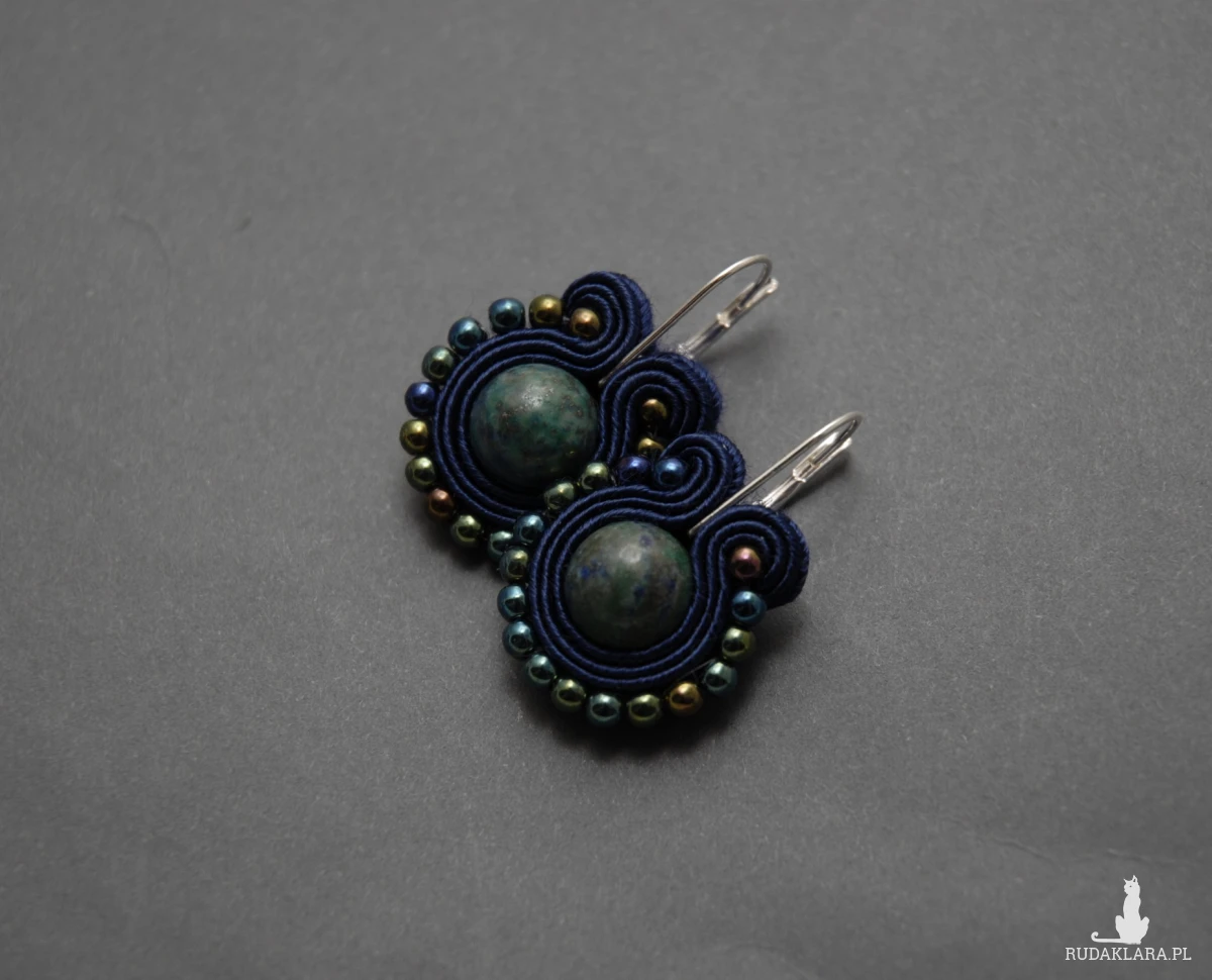 oferuję kolczyki zrobione techniką sutasz, ozdobione chryzokolą i drobnymi koralikami