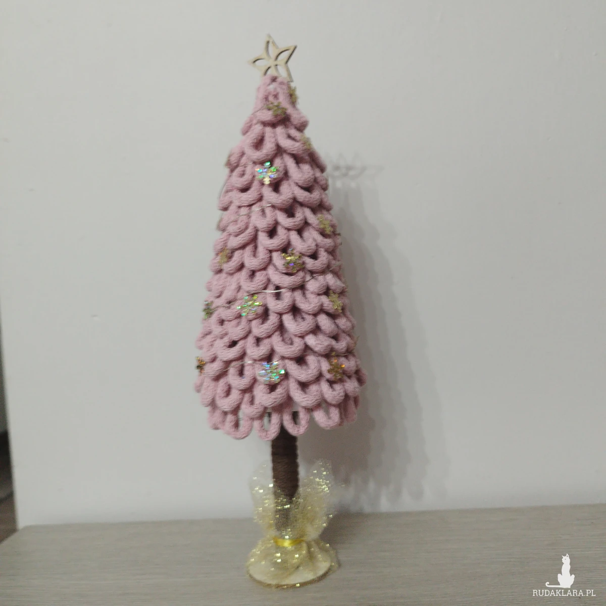 Choinka ze sznurka bawełnianego w kolorze różowym z lampkami. Ozdobiona złotymi gwiazdkami. Wysokość 33cm
