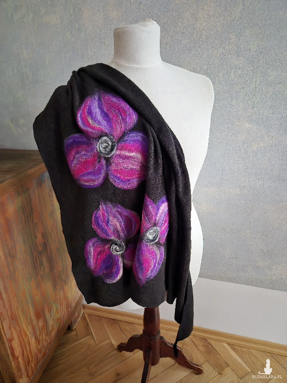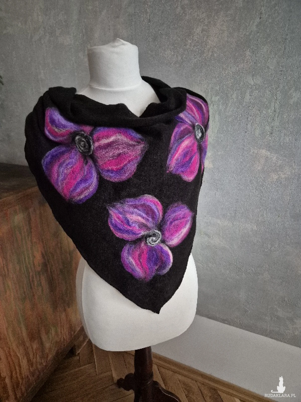 Czarna chusta handmade wełniana, elementy filcowane to wełna merynosów, produkt wysokiej jakości, chusta miła i ciepła, doskonała na chłodne dni, idealna na prezent, wspaniała na codzienne noszenie, zwraca uwagę swą oryginalnością, miękko układa się wokół szyi, absolutny bestseller polecam czas oczekiwania tydzien box x1