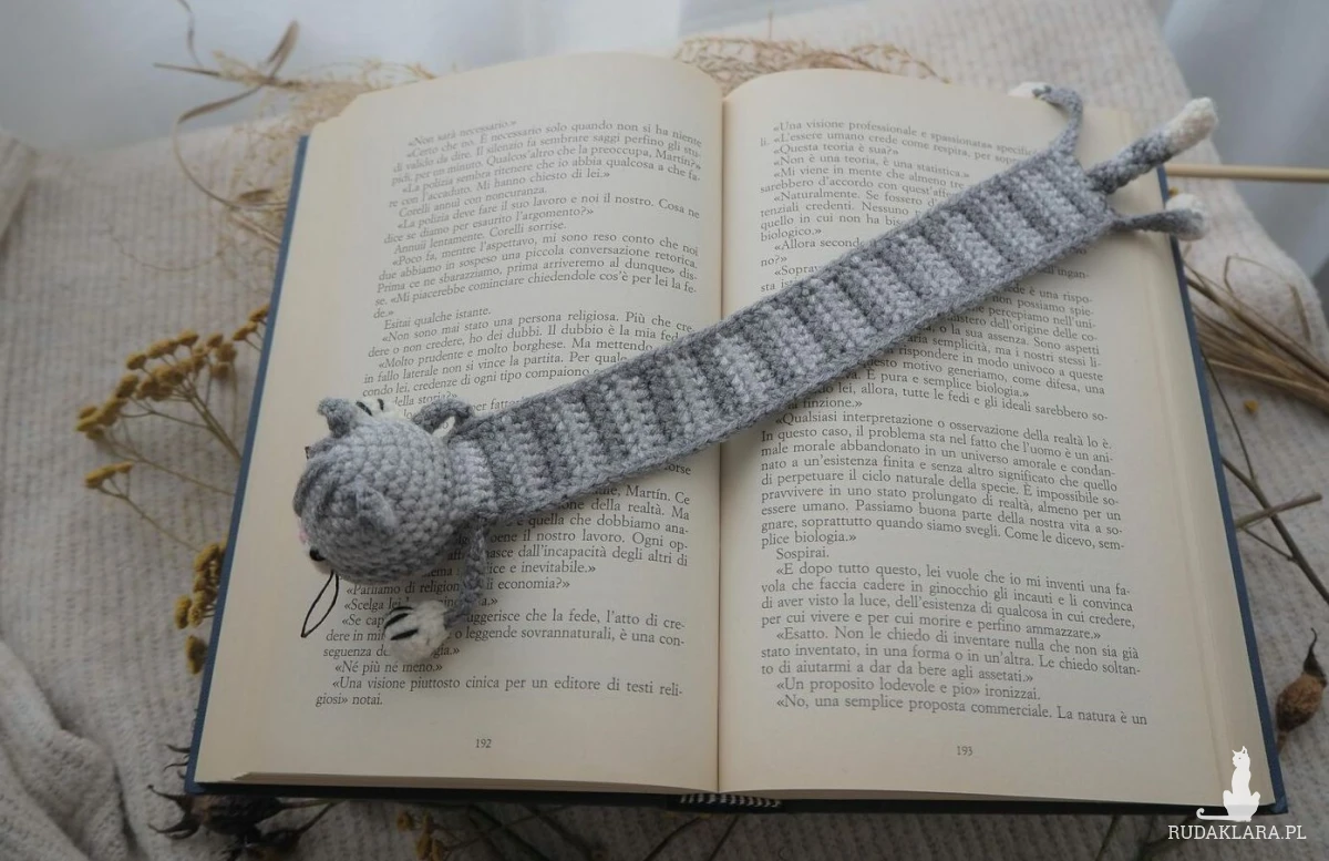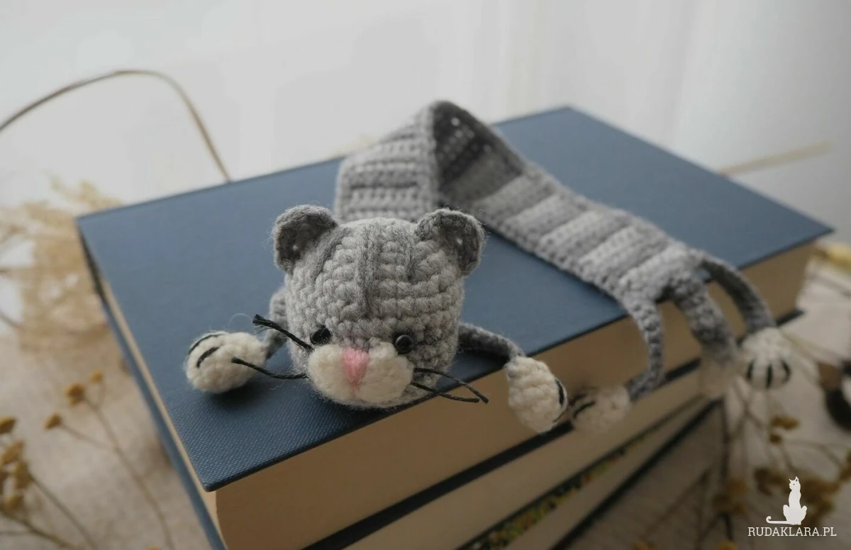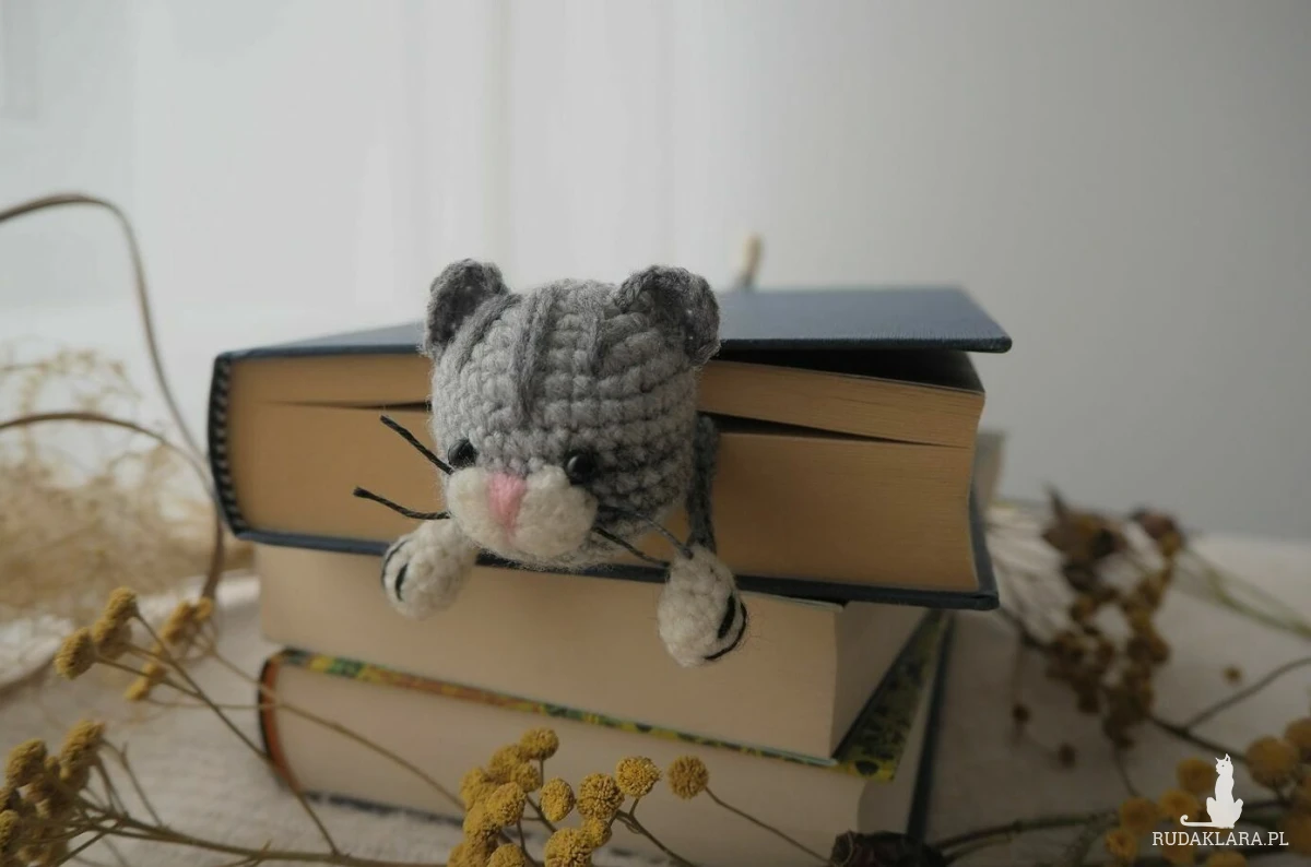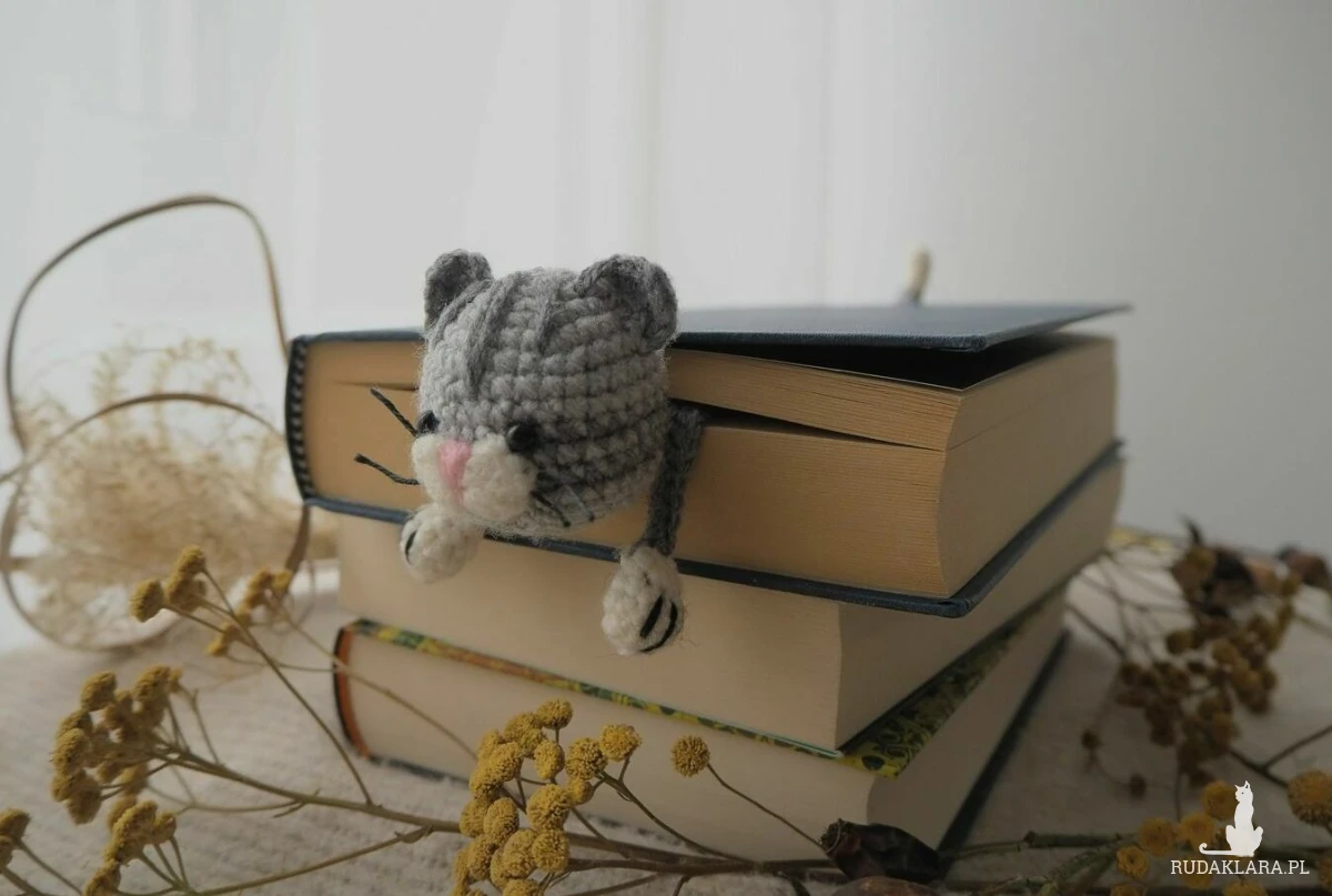 Zakładka do książki z sympatycznym kotem wykonana z włóczki na szydełku.