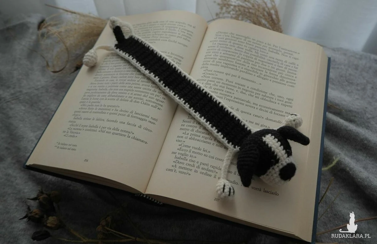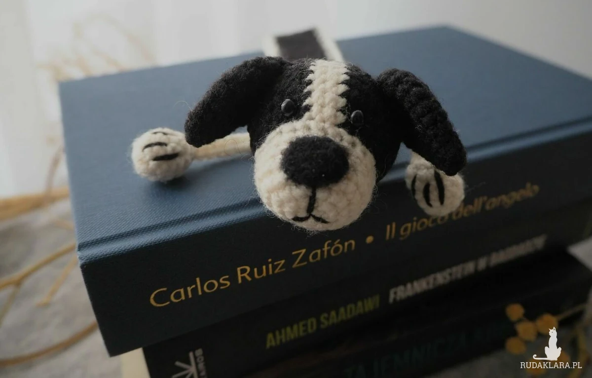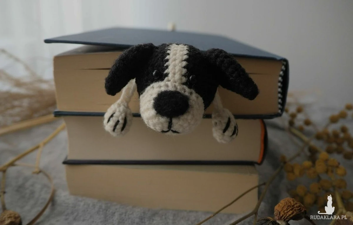Zakładka do książki z sympatycznym pieskiem wykonana z włóczki na szydełku.