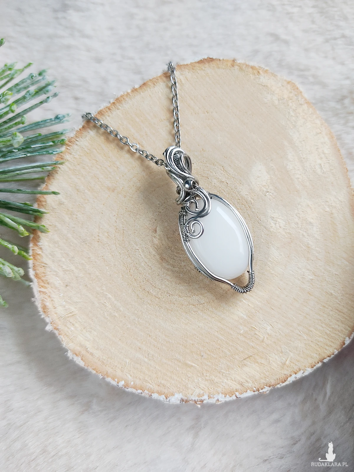 Kwarc mleczny jest kamieniem, który od lat ceniony jest za swój delikatny wygląd oraz symbolikę harmonii i spokoju. Jego miękkie, mleczne tony pięknie odbijają światło, co nadaje naszyjnikowi subtelny blask. Naturalny kamień został starannie dobrany pod względem koloru, a następnie ręcznie otoczony misternymi splotami stworzonymi techniką wire wrapping. Dzięki temu każdy egzemplarz jest niepowtarzalny i może różnić się od innych w drobnych detalach, co daje wrażenie posiadania biżuterii stworzonej tylko dla jednej osoby.