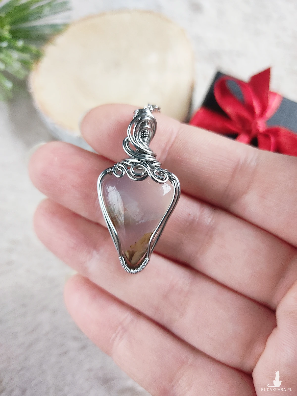 Agat river lace wyróżnia się unikatowym wzorem przywodzącym na myśl zimowy krajobraz — delikatne linie i warstwowe struktury kamienia wyglądają jak fale zamarzniętego jeziora lub lodowe pasma biegnące po powierzchni skały. Właśnie dlatego kamień ten został wybrany jako jeden z głównych elementów kolekcji zimowo-świątecznej. W naszyjniku jego naturalne piękno zostało podkreślone poprzez misterną oprawę wykonaną ręczną techniką wire wrapping. Stal chirurgiczna otula minerał w sposób, który zapewnia stabilność, a jednocześnie nie przytłacza jego subtelnych wzorów.