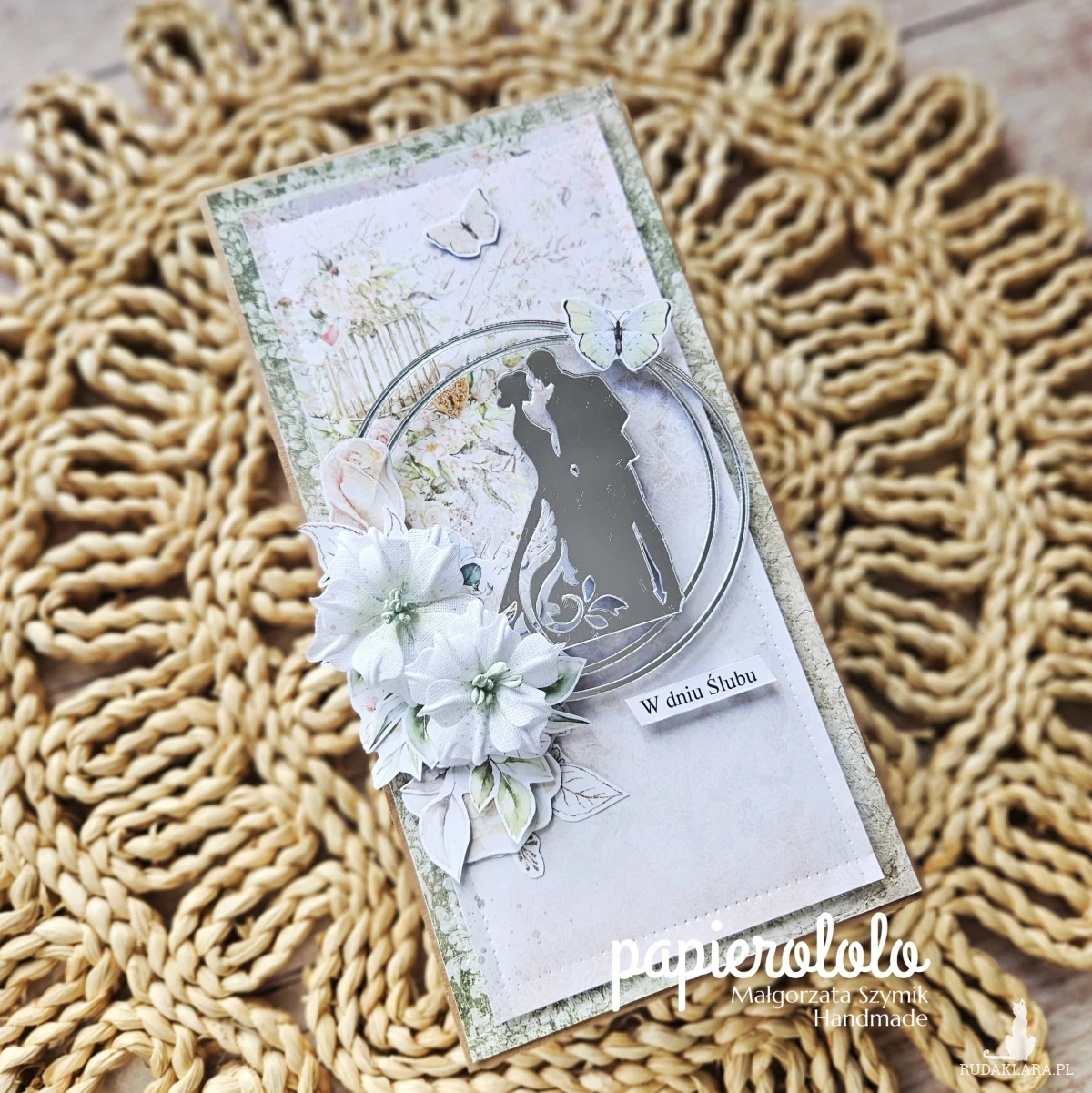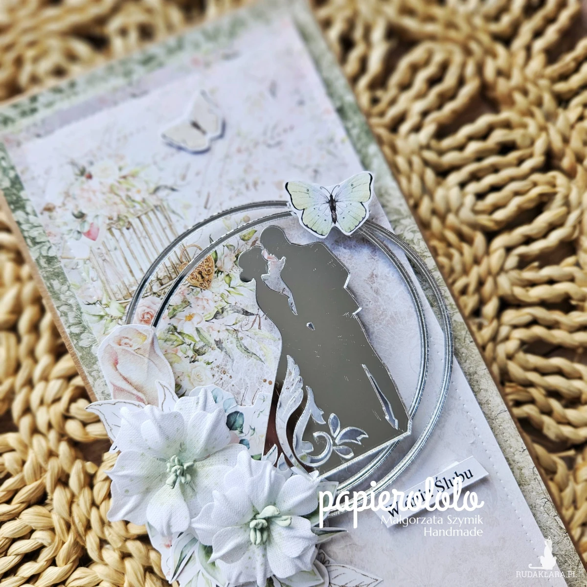 Kartka z okazji ślubu lub rocznicy ślubu. Wykonana z papieru z nadrukiem i ozdobiona kwiatami z materiału oraz papierowymi dodatkami.