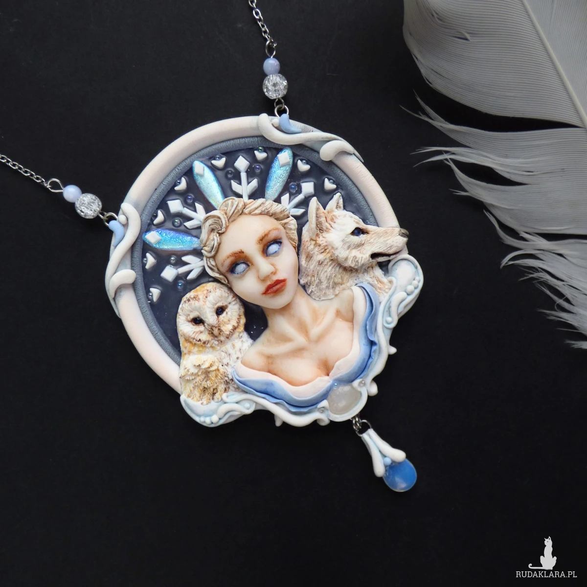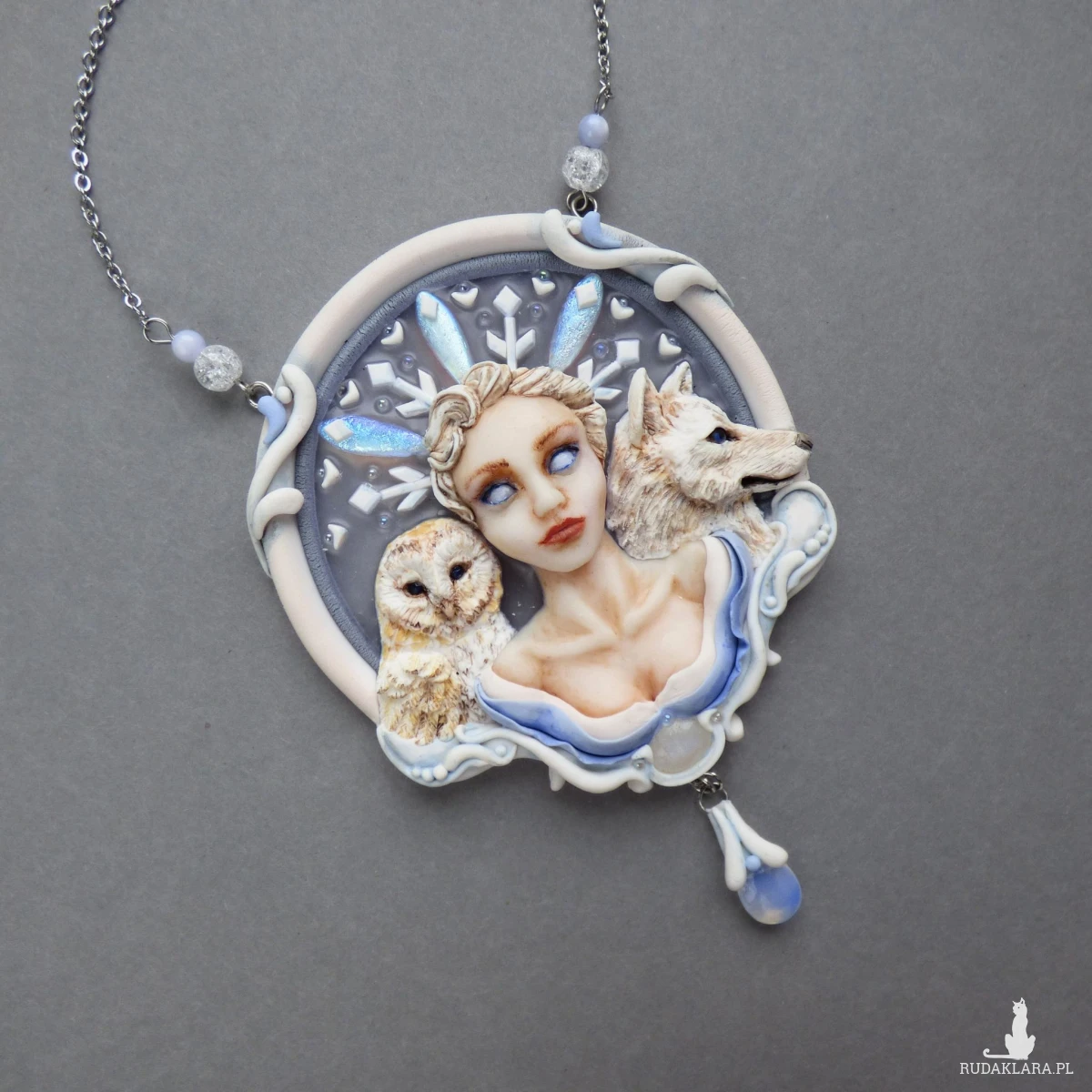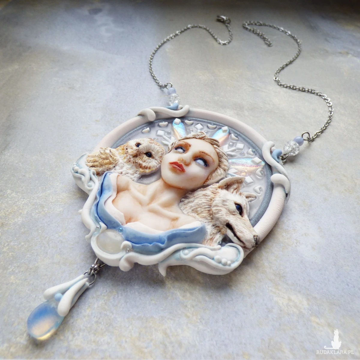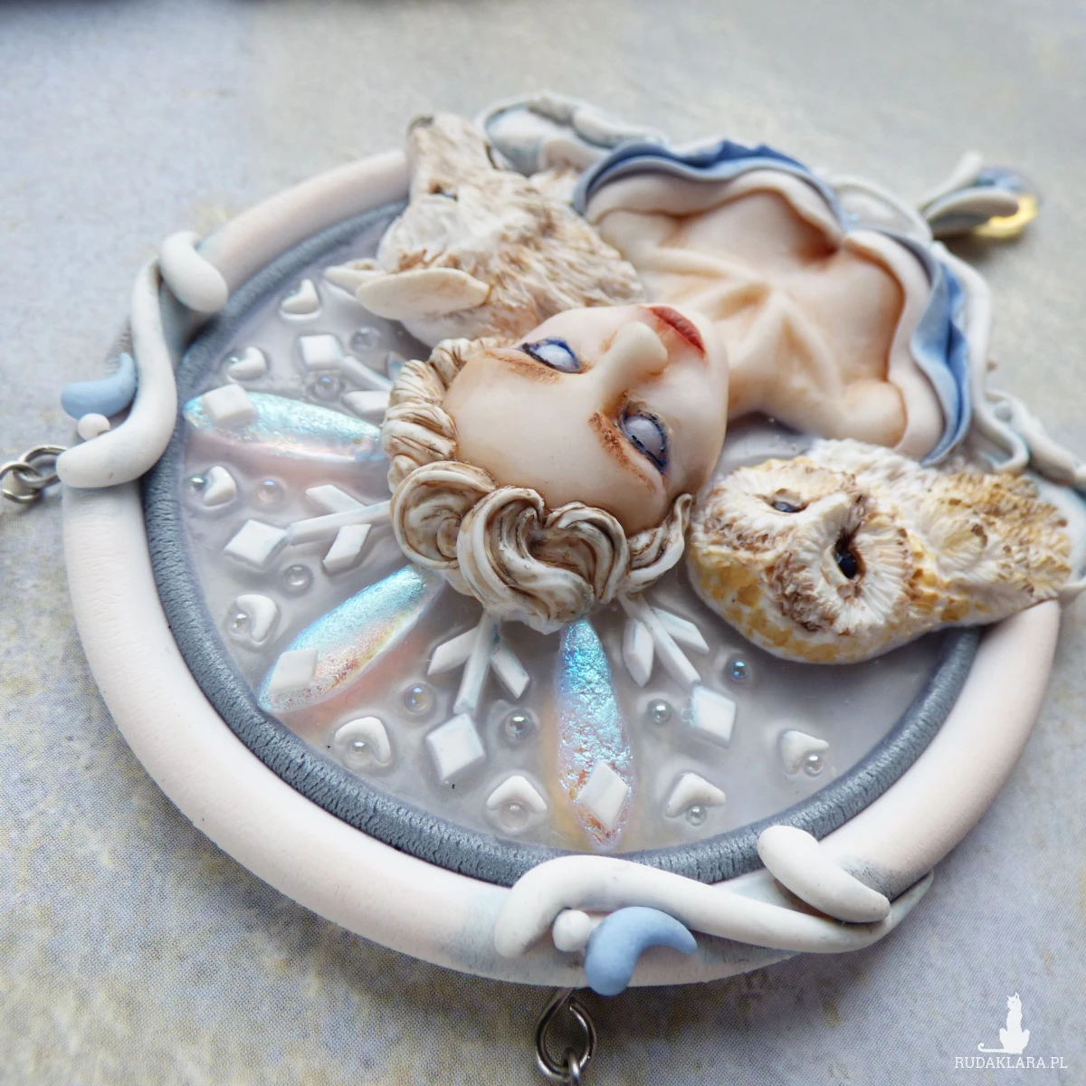 ręcznie modelowany naszyjnik z glinki polimerowej – każdy detal (twarz, sowa, wilk, ornamenty) wyrzeźbiony w całości ręcznie