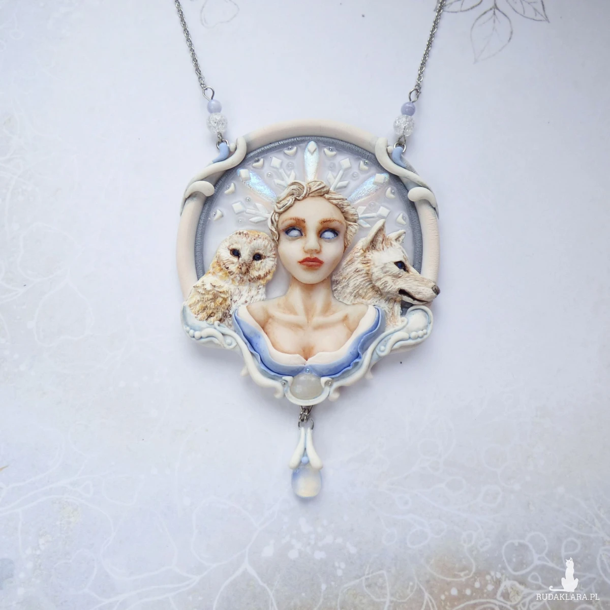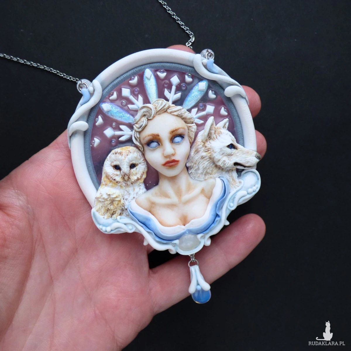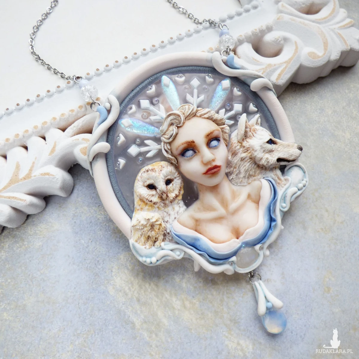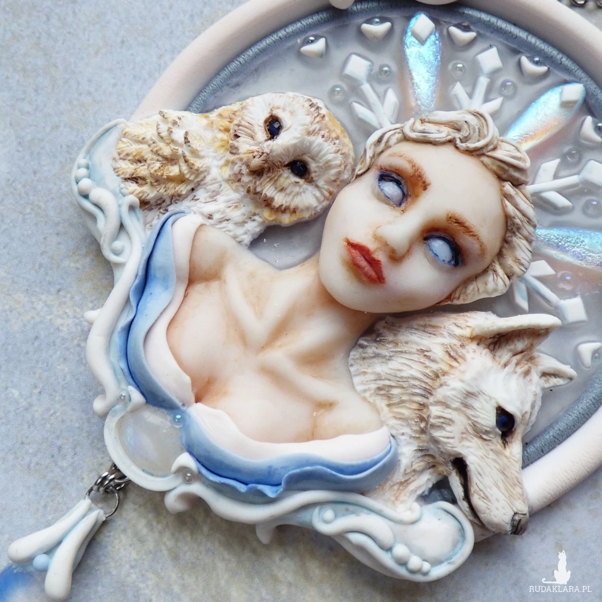 ręcznie modelowany naszyjnik z glinki polimerowej – każdy detal (twarz, sowa, wilk, ornamenty) wyrzeźbiony w całości ręcznie