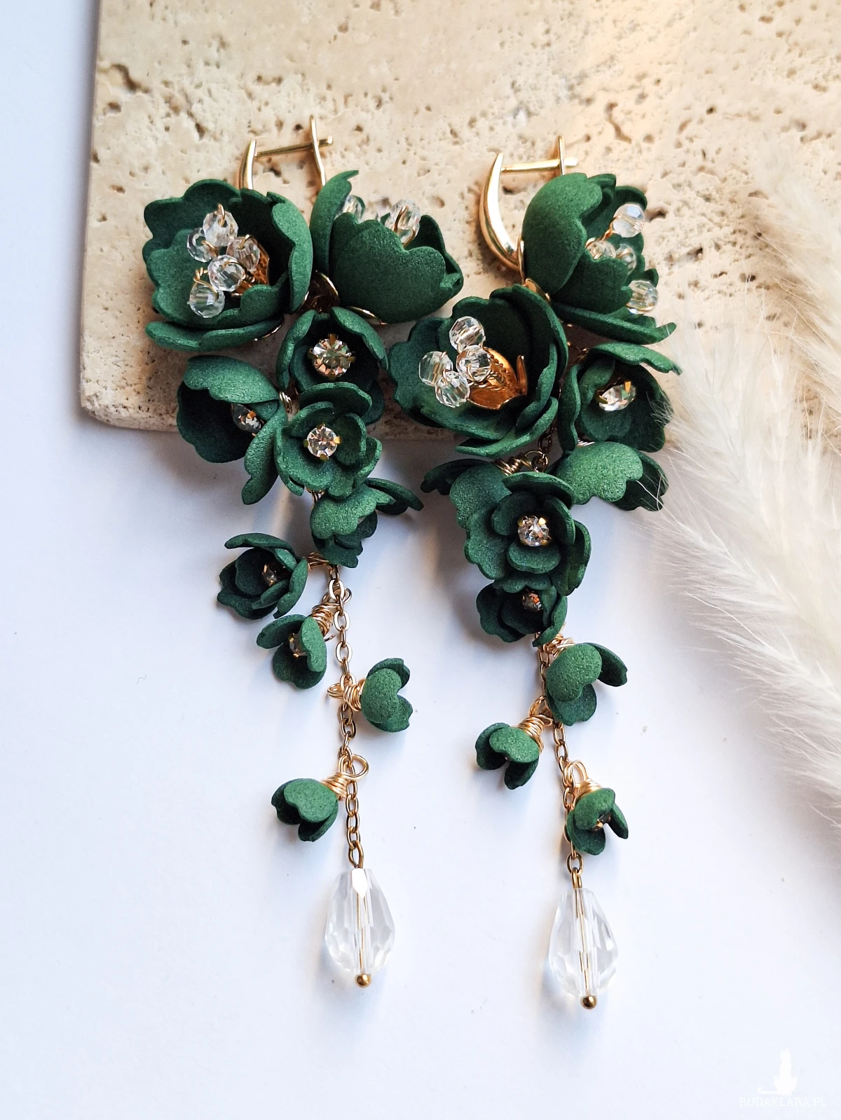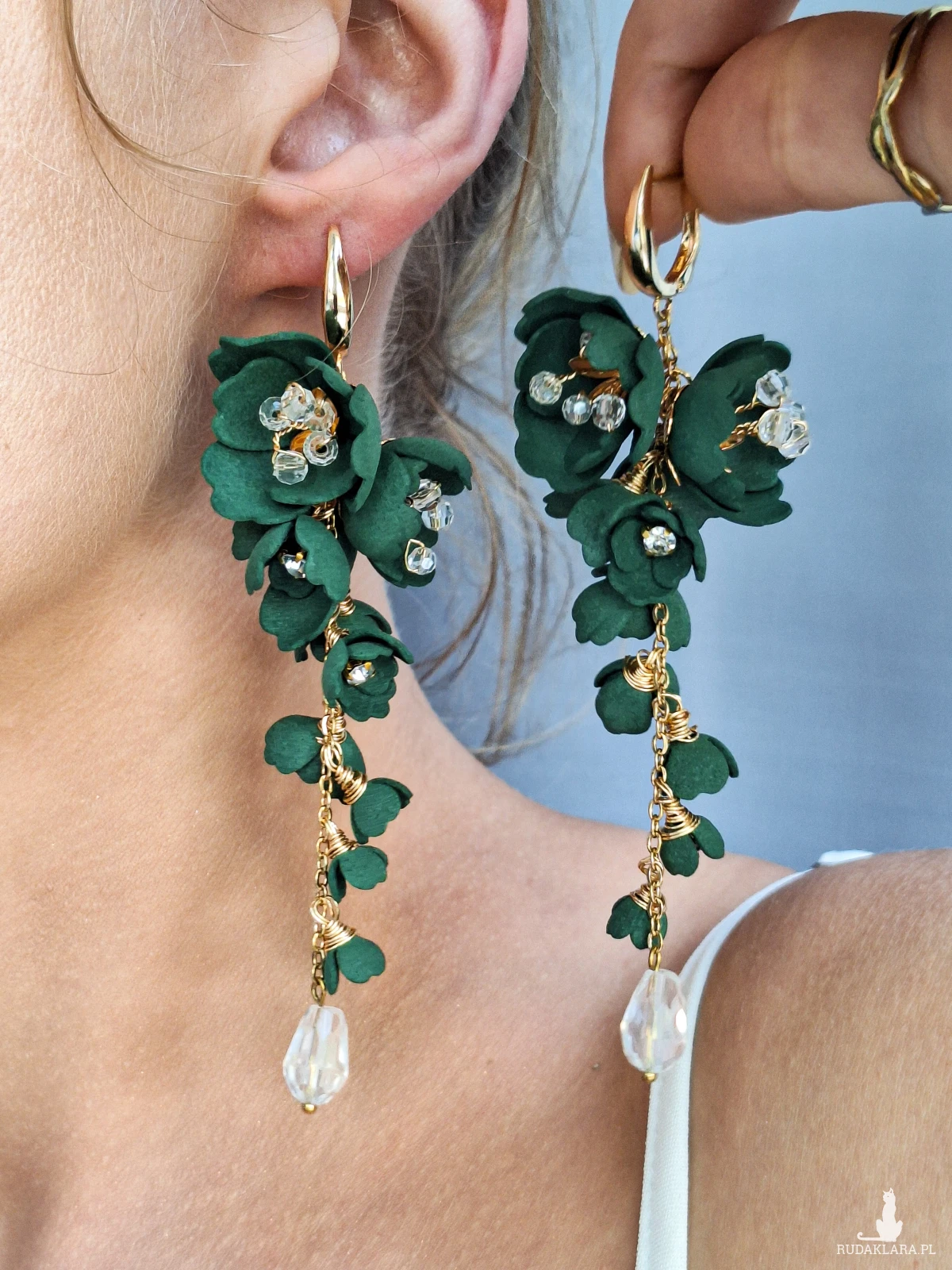 Wyjątkowe, artystyczne kolczyki, które zachwycają swoją lekkością i detalem. Każdy kwiat został wykonany ręcznie, a całość uzupełniają kryształowe akcenty oraz złocone elementy, nadające im elegancji i blasku.