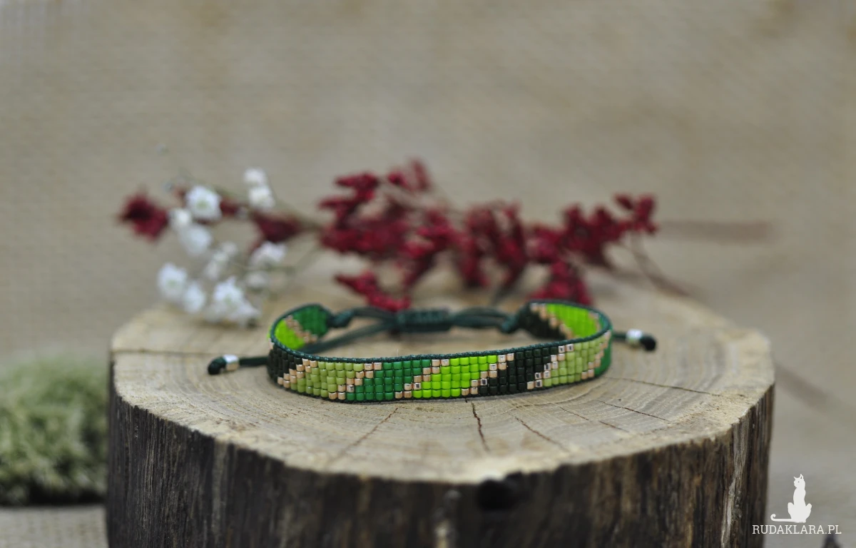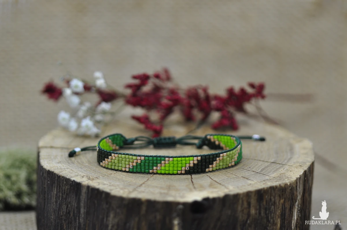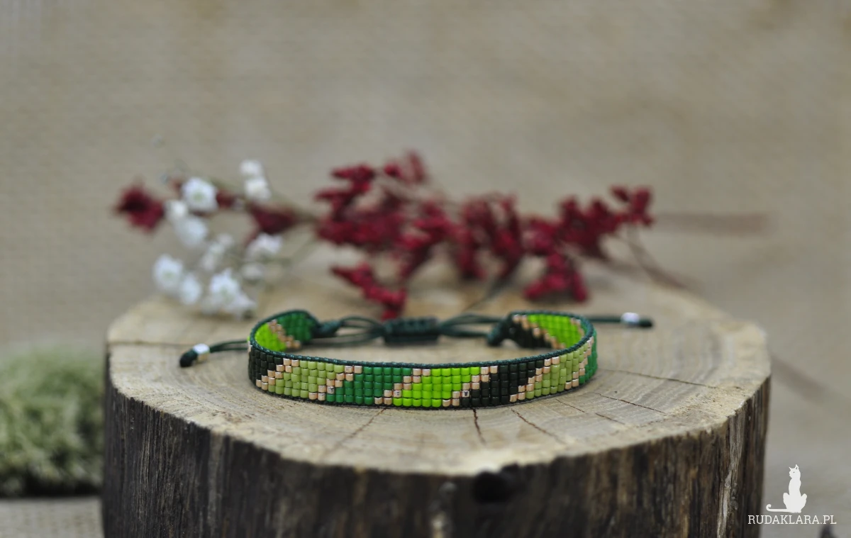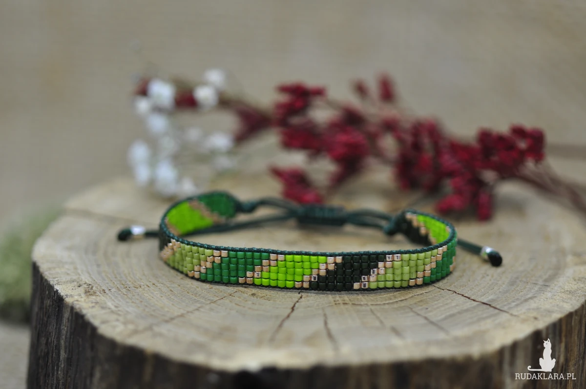 Bransoletka w odcieniach zieleni i srebra z delikatnym odcieniem różu.