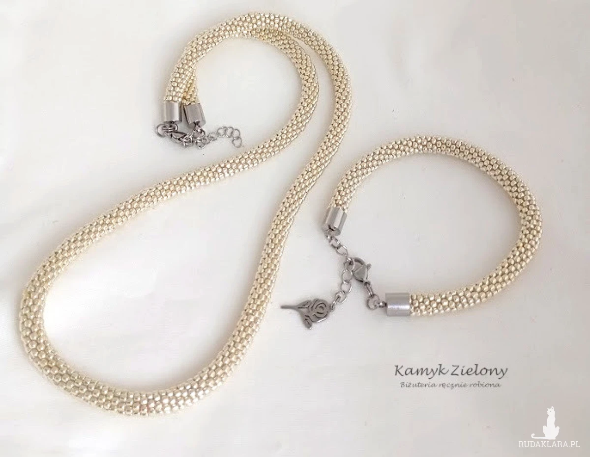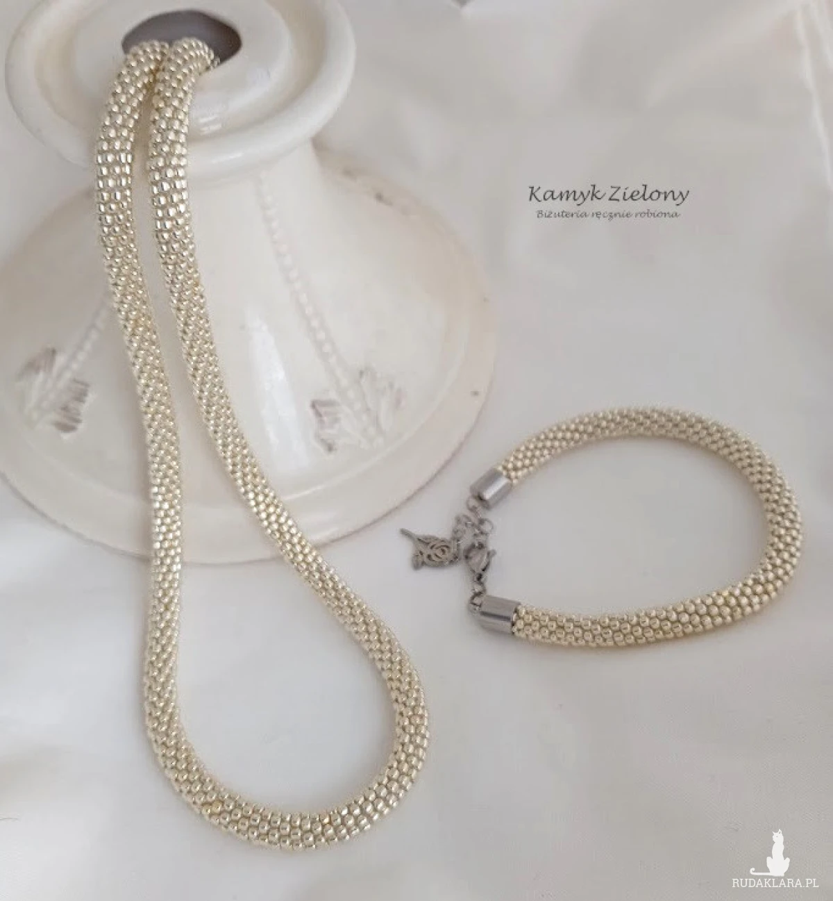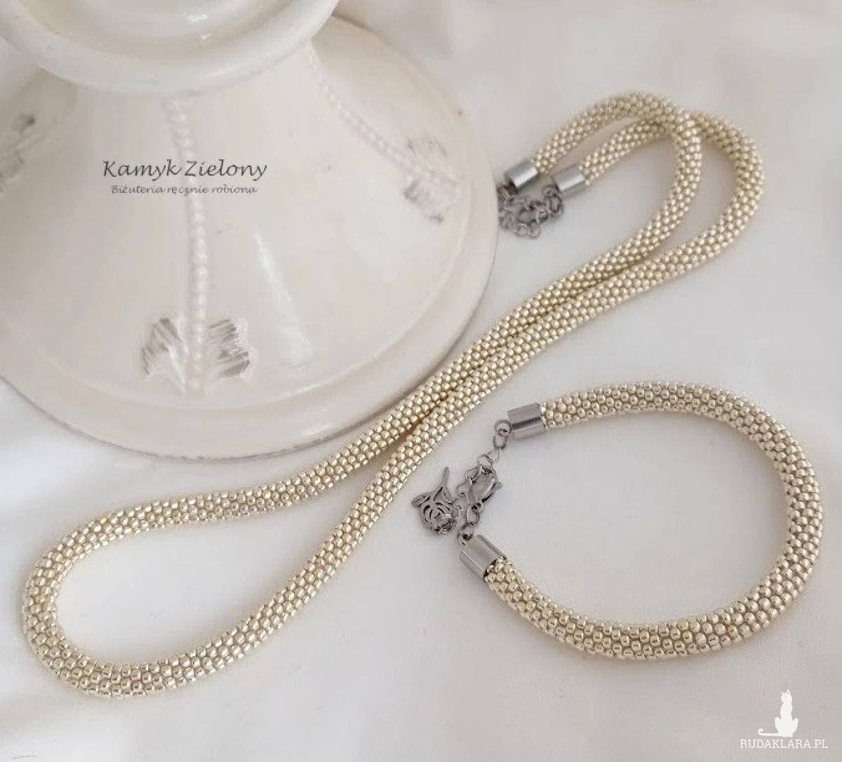 Komplet złożony ze średniej długości naszyjnika oraz bransoletki, w całości wykonany ręcznie z drobnych koralików Toho w kolorze srebrnym, wpadającym w delikatny złotawy odcień.