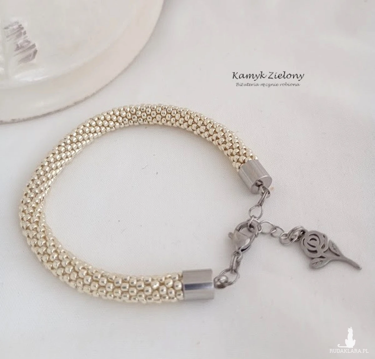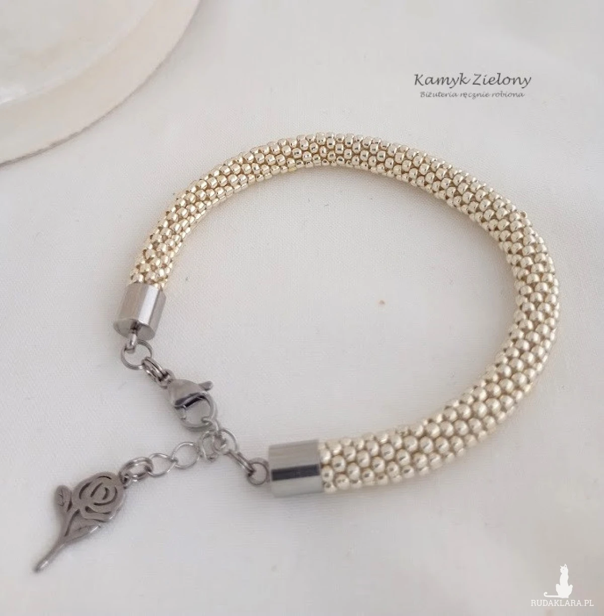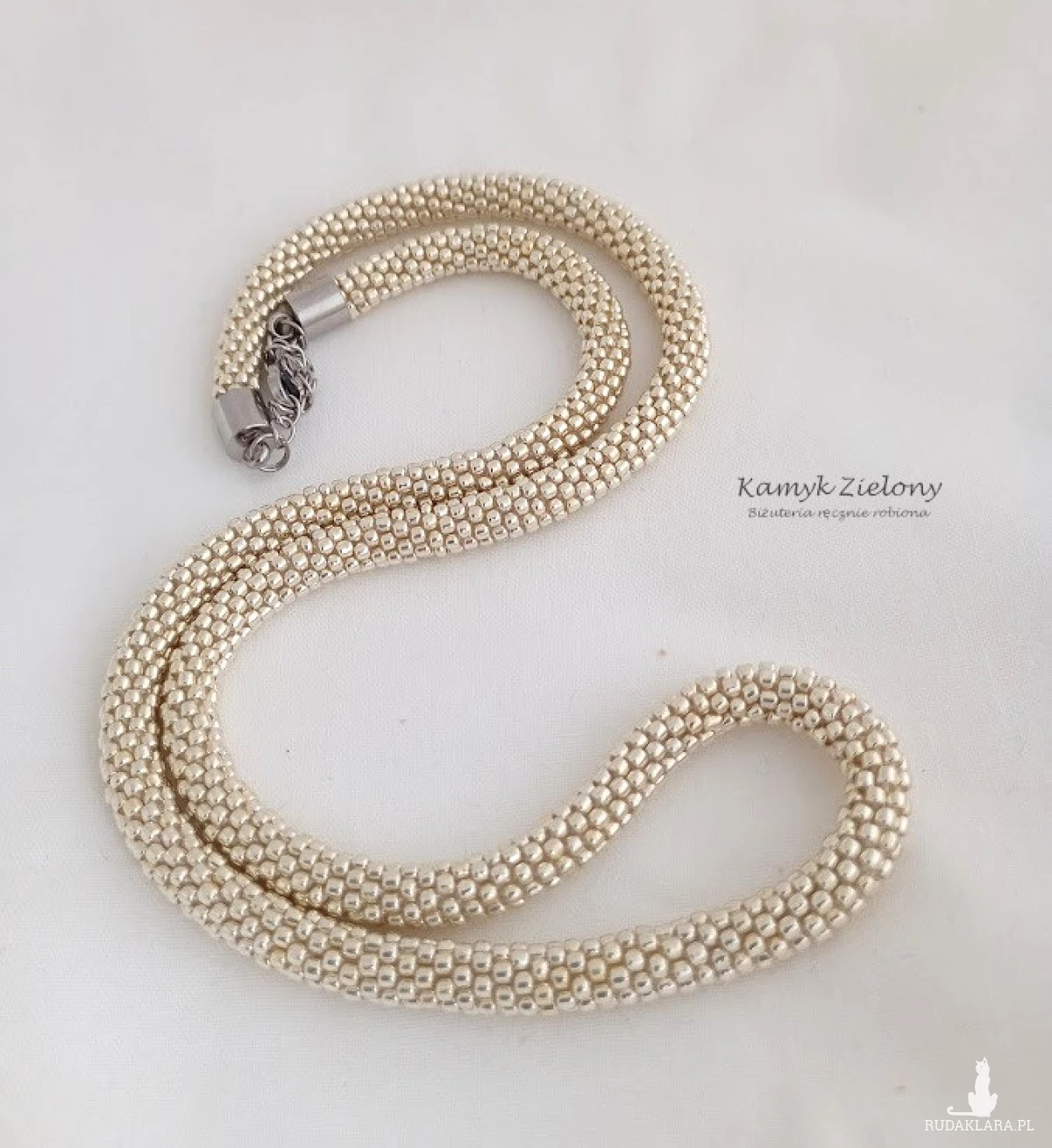 Komplet złożony ze średniej długości naszyjnika oraz bransoletki, w całości wykonany ręcznie z drobnych koralików Toho w kolorze srebrnym, wpadającym w delikatny złotawy odcień.