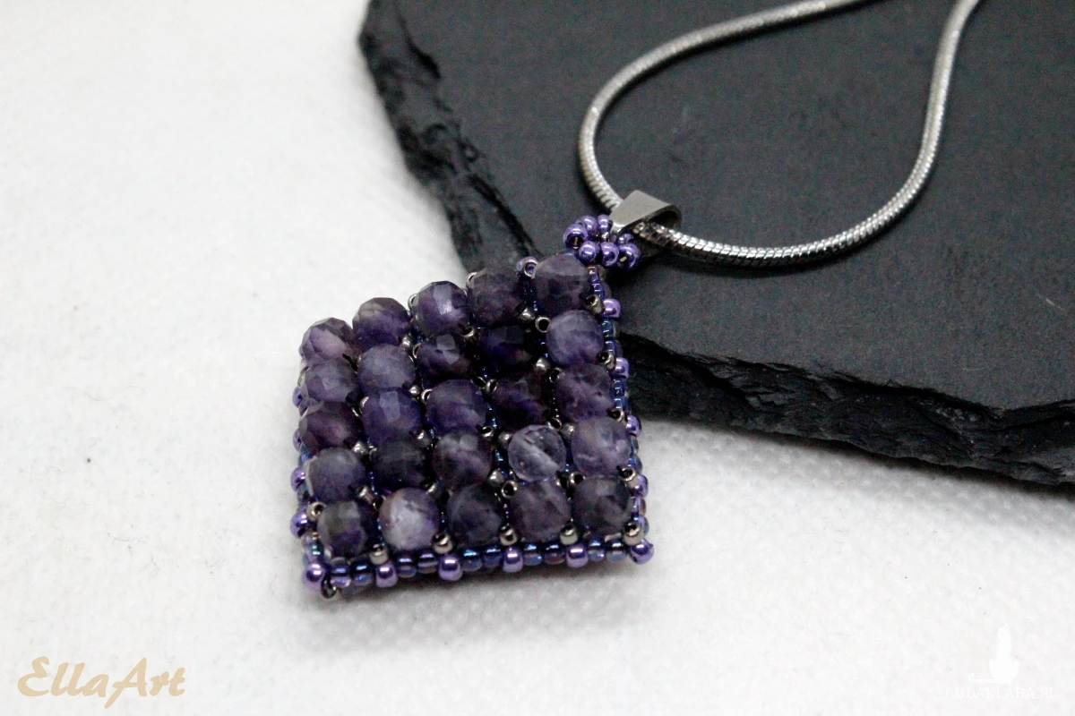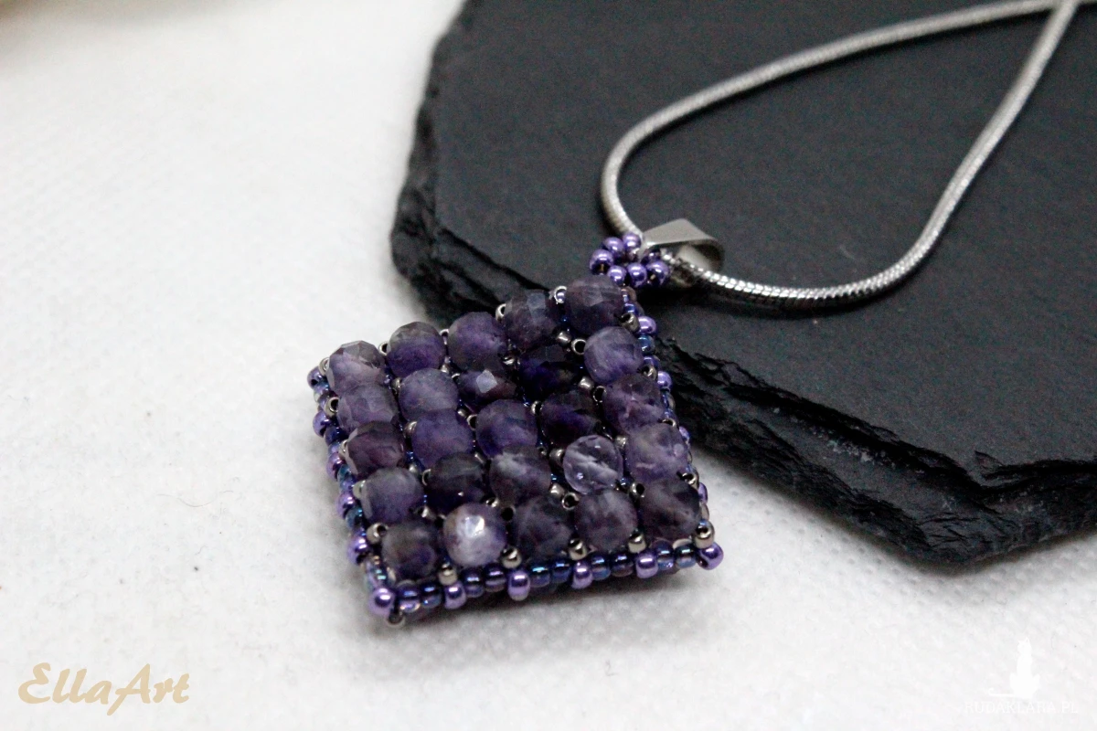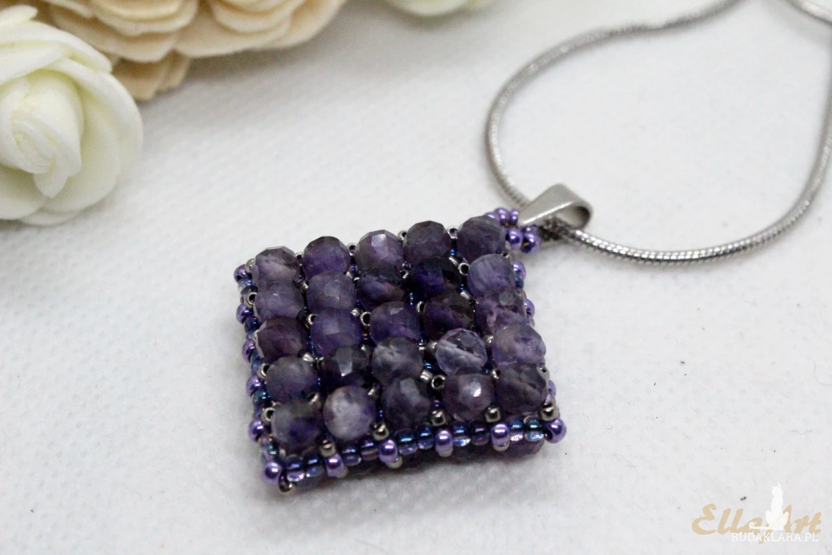 Wisior uszyty ręcznie z drobniutkich, szklanych koralików japońskiej firmy Toho oraz naturalnych kamieni ametystu o wielkości 4mm