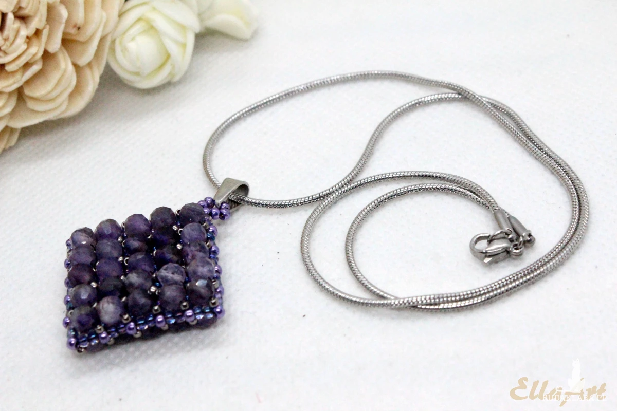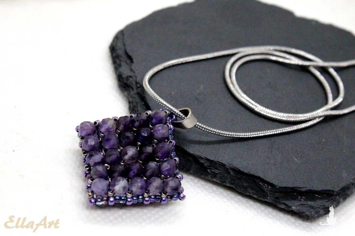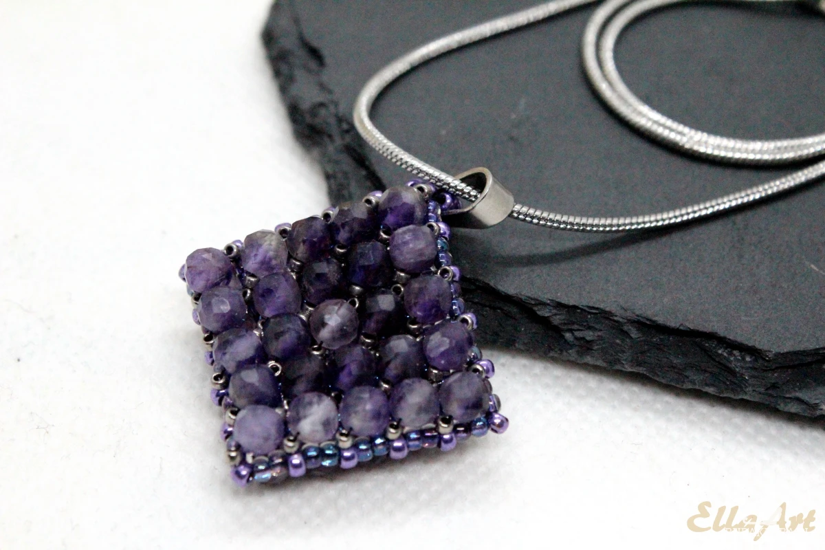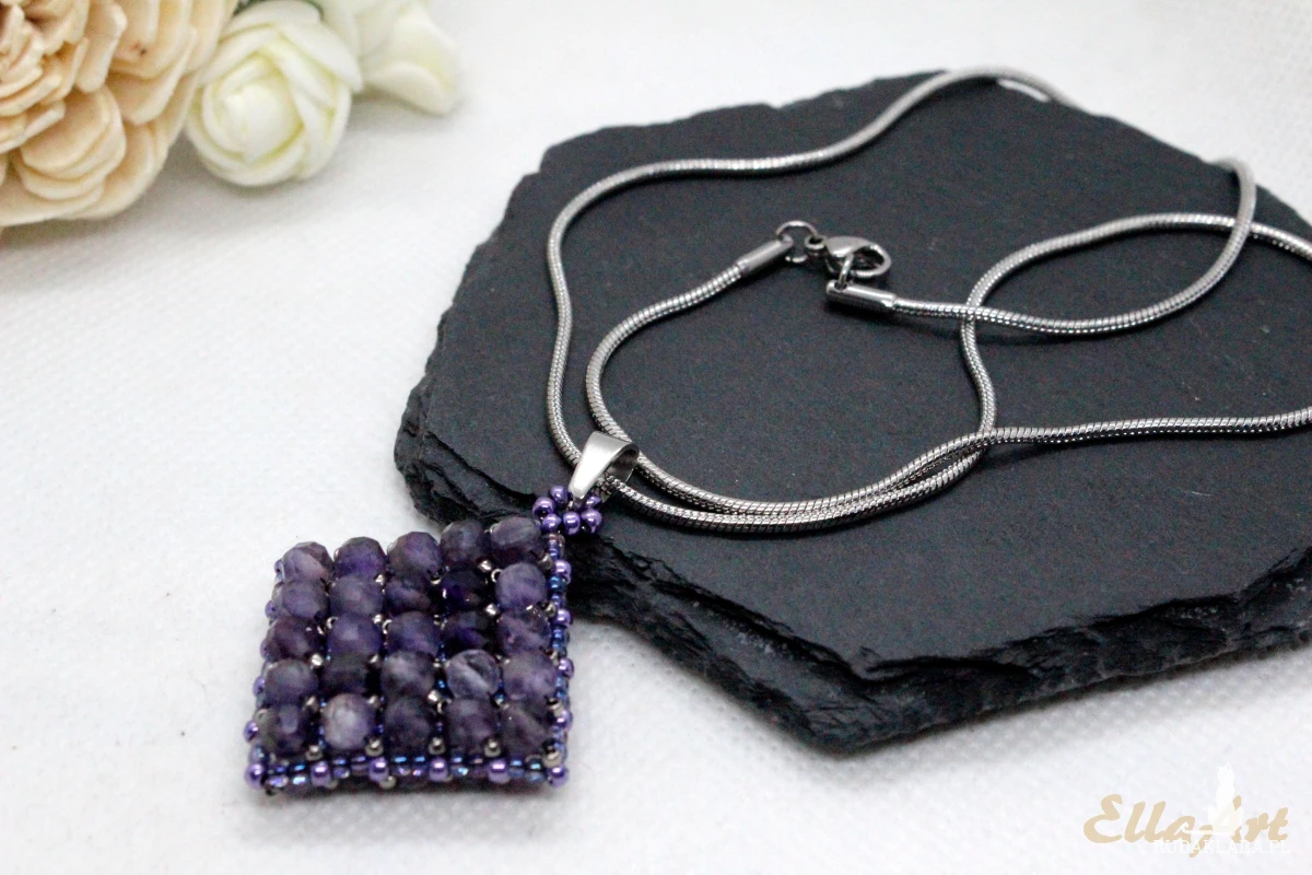 Wisior uszyty ręcznie z drobniutkich, szklanych koralików japońskiej firmy Toho oraz naturalnych kamieni ametystu o wielkości 4mm