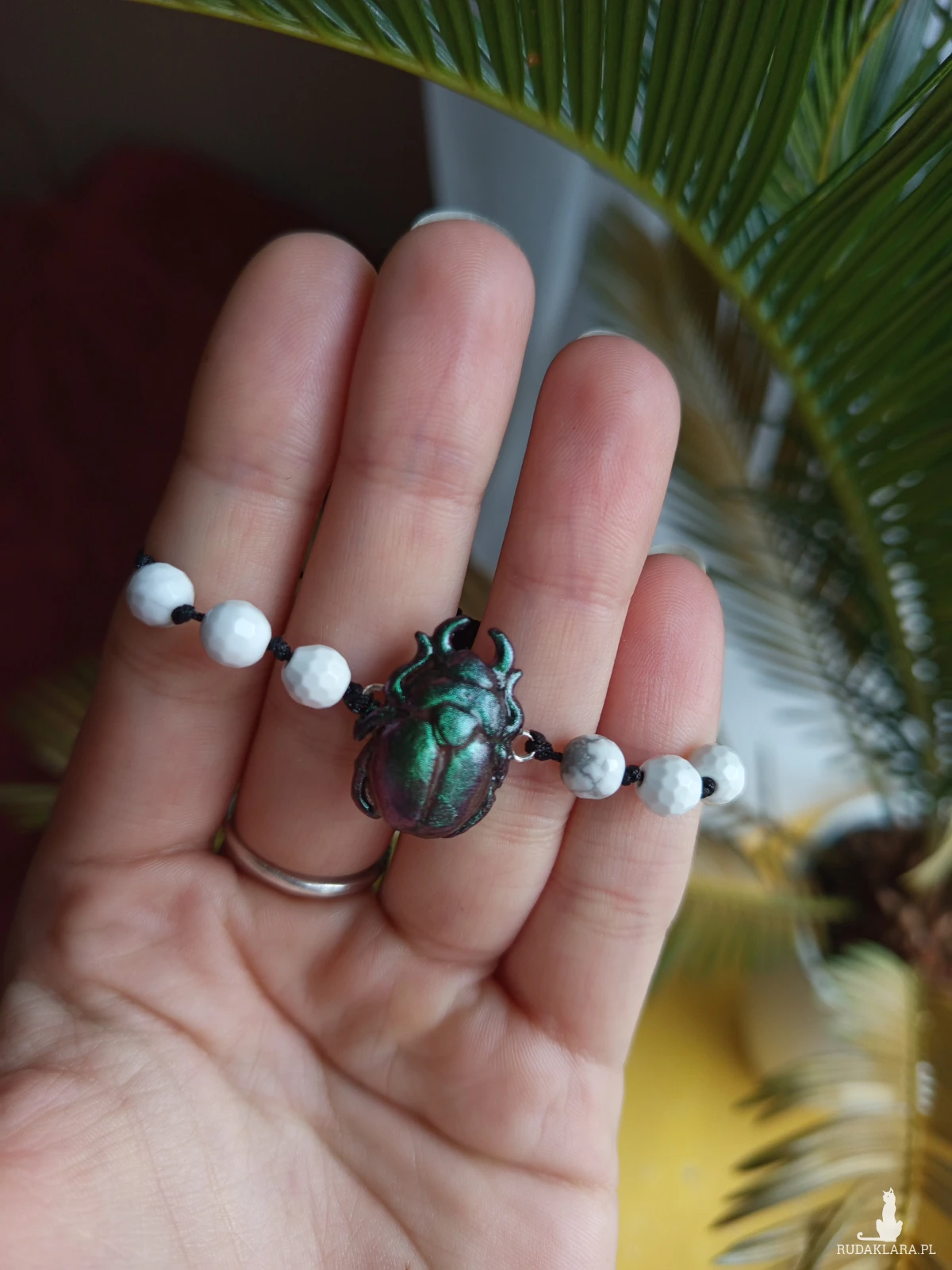 Pełna uroku i naturalnej symboliki – ta ręcznie wykonana bransoletka ozdobiona jest miniaturowym żuczkiem z glinki polimerowej, który przywołuje leśny klimat i subtelną magię natury. Towarzyszy mu howlit, minerał wyciszenia, harmonii i wewnętrznego spokoju, dzięki czemu bransoletka emanuje delikatną, uspokajającą energią.
