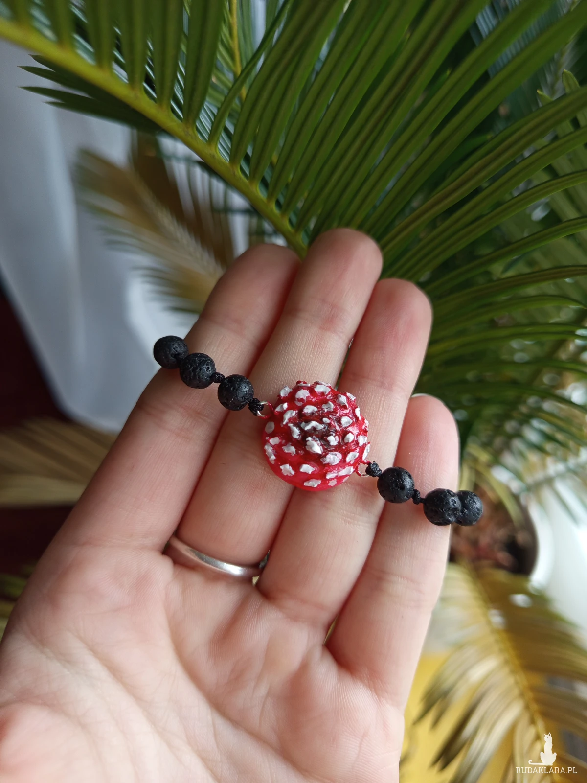 Urocza, lekko baśniowa i pełna dobrej energii – ta ręcznie wykonana bransoletka zachwyci każdego miłośnika natury i magicznych akcentów. W jej centrum znajduje się miniaturowy muchomorek z glinki polimerowej, starannie wyrzeźbiony i pomalowany, który przywołuje klimat leśnych wędrówek.
