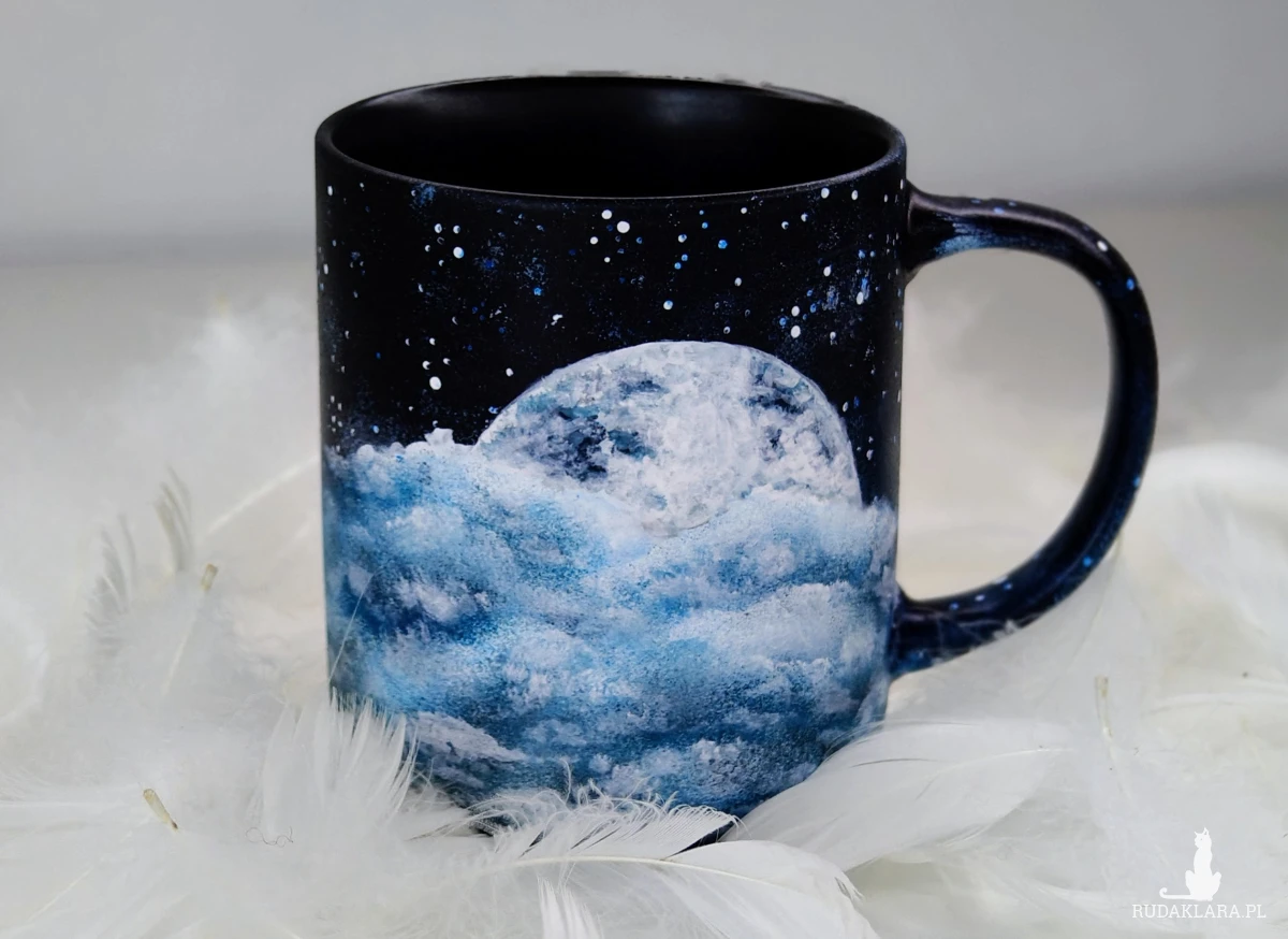 Ręcznie malowany kubek z motywem nocnego nieba, chmur, kosmosu i księżyca. Jest on wykonany przy użyciu wysokiej jakości farb porcelanowych i wypalony w wysokiej temperaturze. Kubek ma pojemność 400 ml.