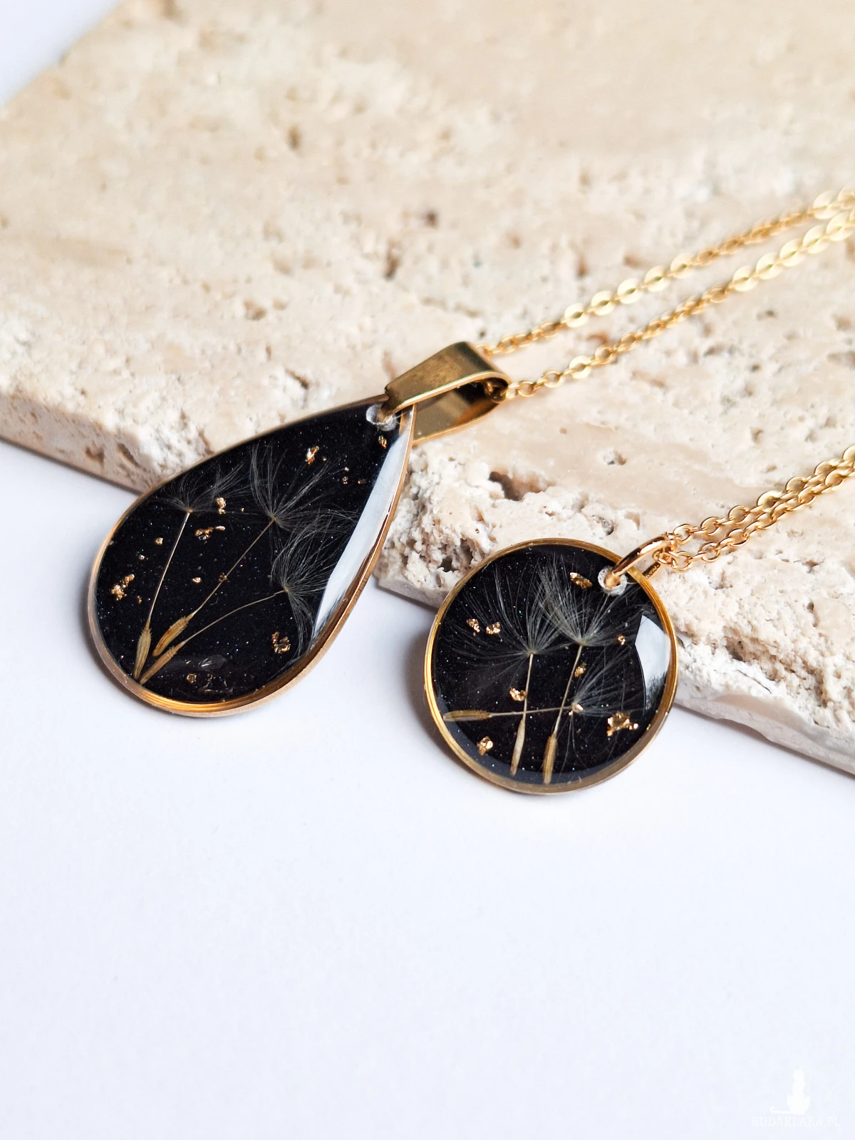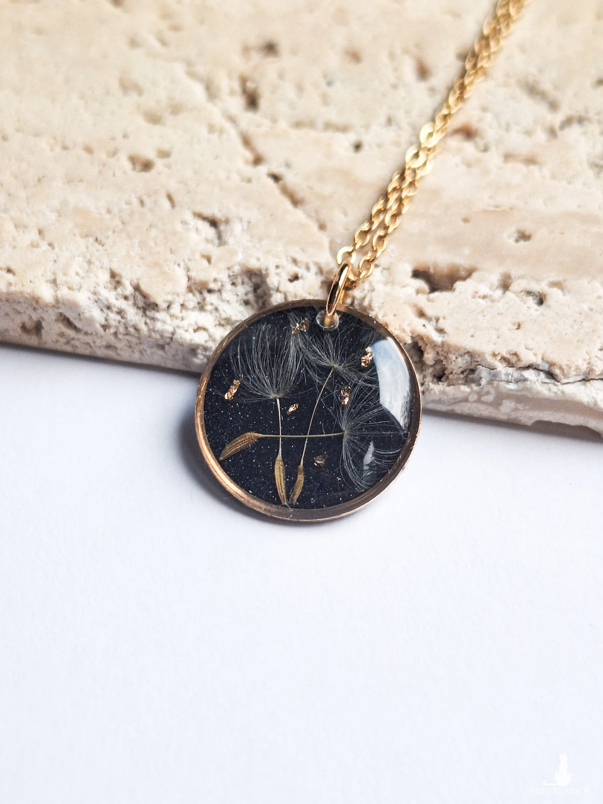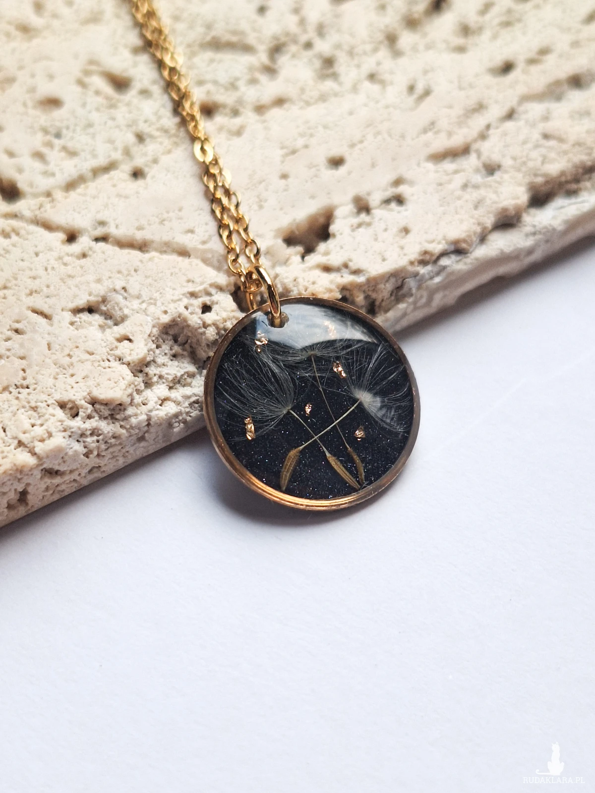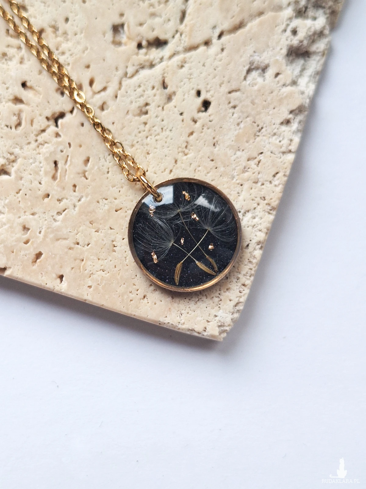 Uroczy wisiorek z zatopionymi nasionami dmuchawca i płatkami złotana czarnym, połyskującym tle. Wykonany z wysokiej klasy żywicy, która nie zmienia koloru pod wpływem promieniowania uv oraz wysokiej jakości stali chirurgicznej.