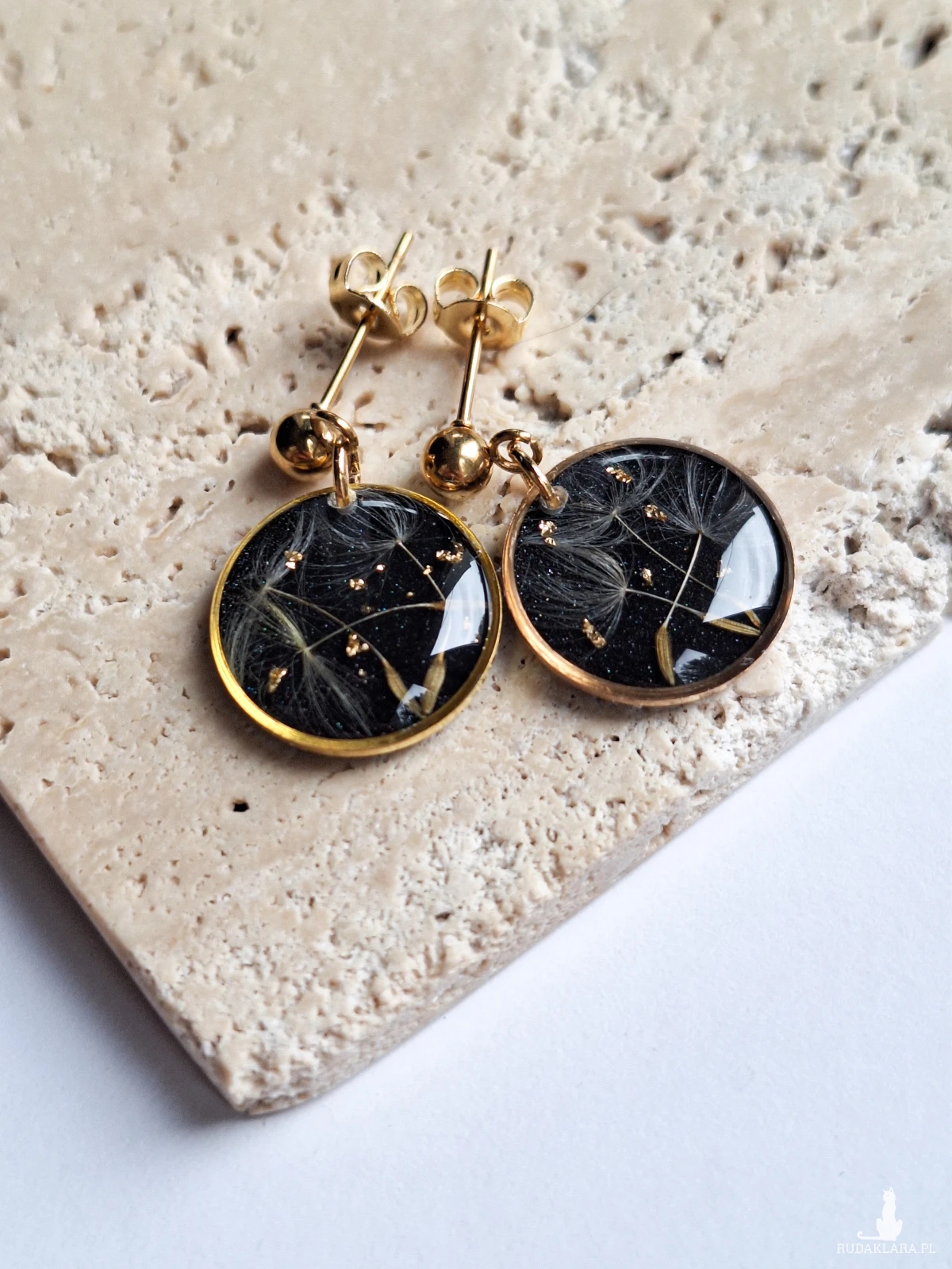 Urocze kolczyki w kształcie kółka z zatopionymi nasionami dmuchawca i płatkami złota na czarnym, błyszczącym tle. Wykonane z wysokiej klasy żywicy, która nie zmienia koloru pod wpływem promieniowania UV oraz wysokiej jakości stali chirurgicznej.