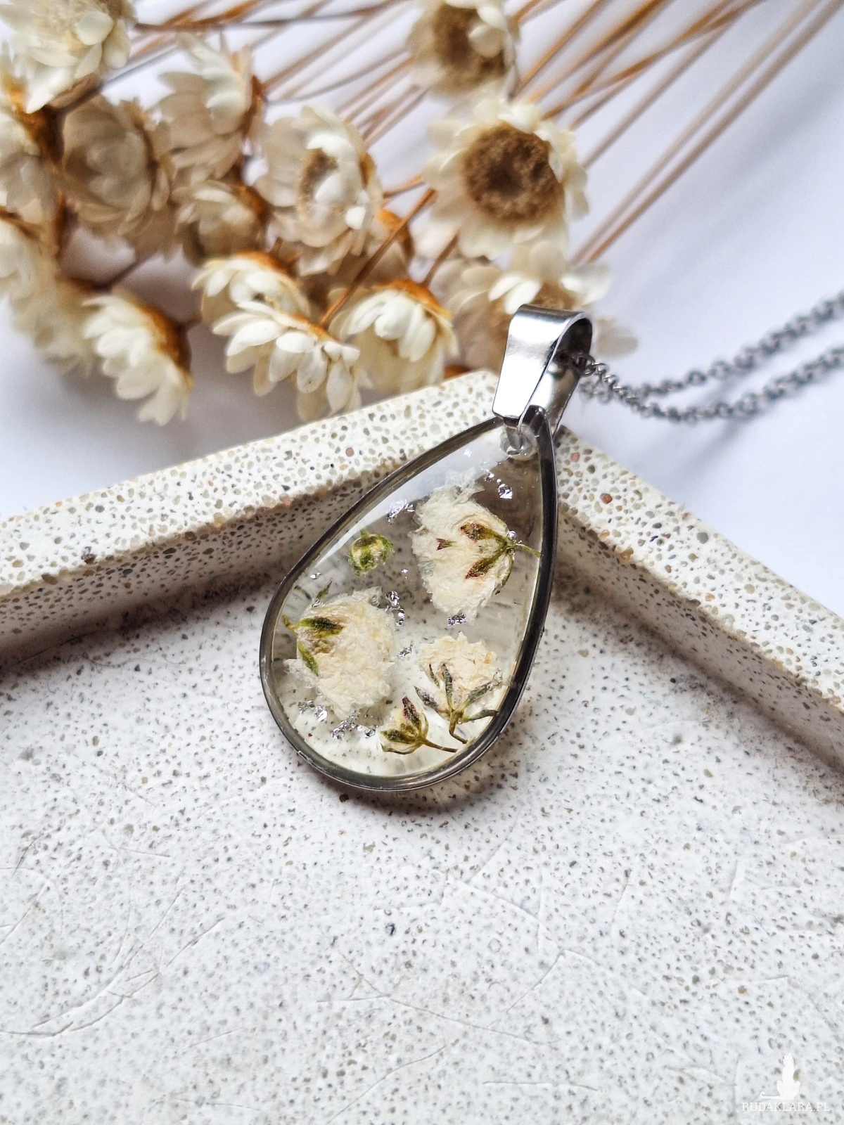 Uroczy wisiorek w kształcie łezki z zatopionymi kwiatami białej gipsówki i płatkami srebra. Wykonany z wysokiej klasy żywicy, która nie zmienia koloru pod wpływem promieniowania uv oraz wysokiej jakości stali chirurgicznej.