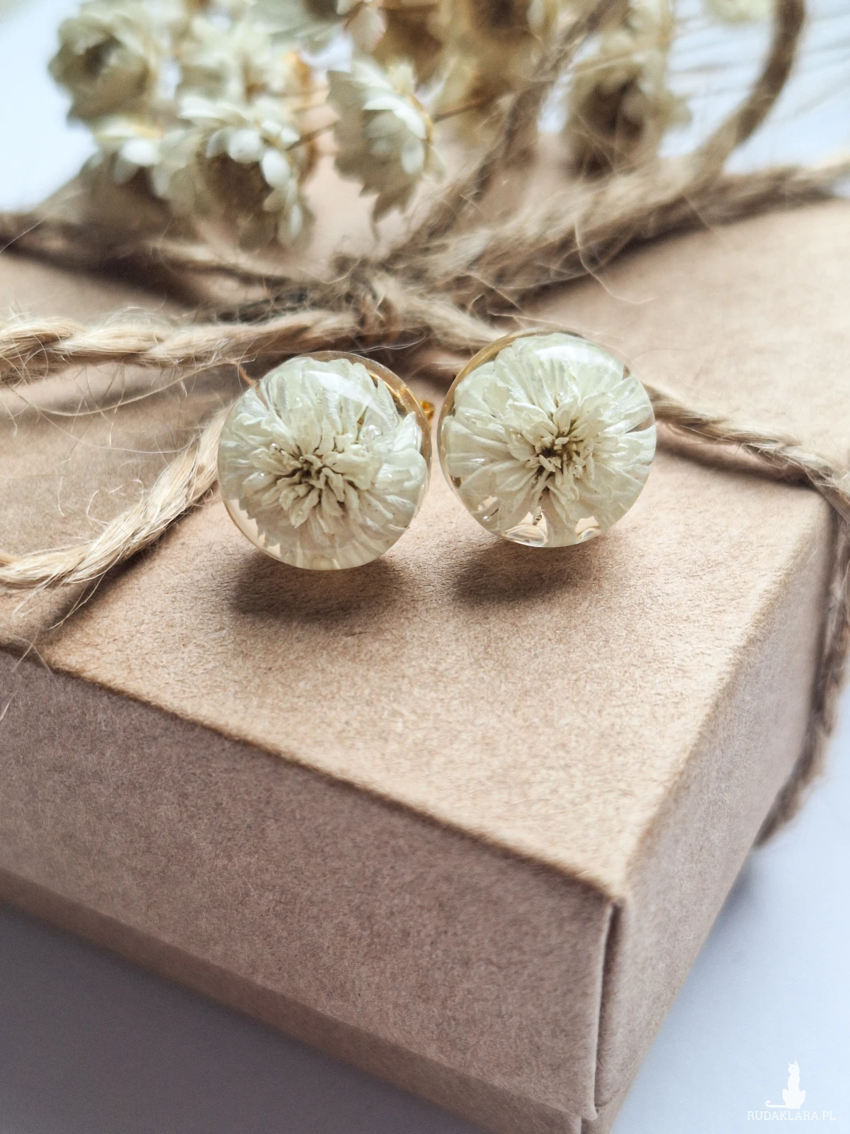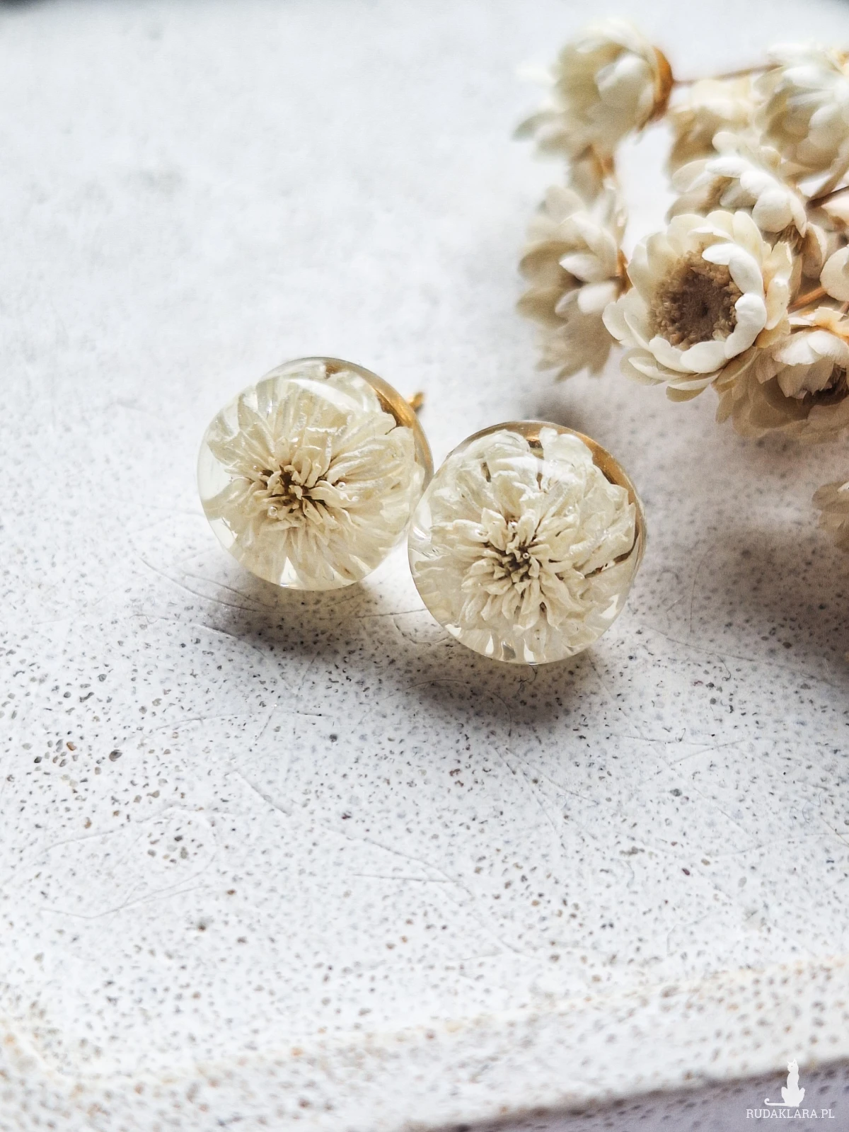 Urocze kolczyki sztyfty z zatopionym kwiatem krwawnika. Wykonane z wysokiej klasy żywicy, która nie zmienia koloru pod wpływem promieniowania UV oraz wysokiej jakości stali chirurgicznej.