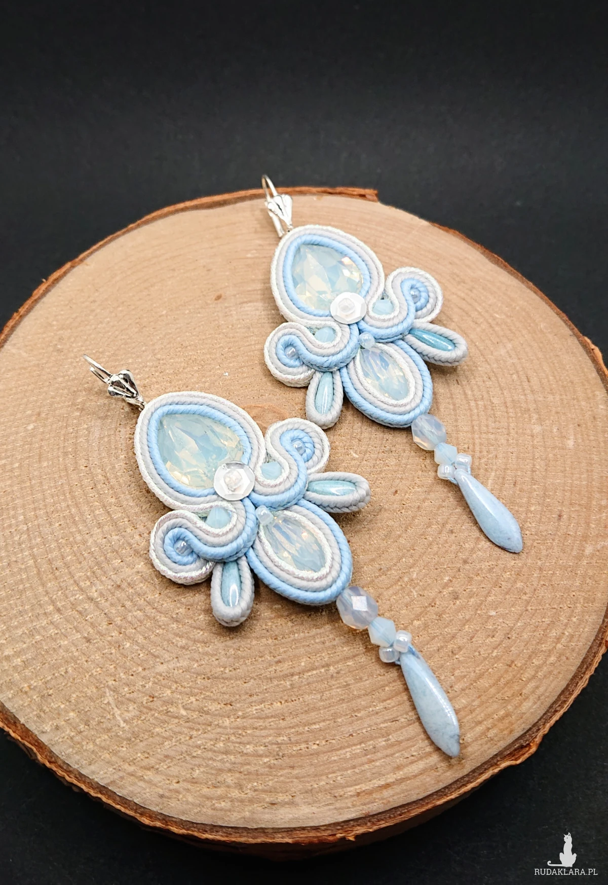 Kryształki z żywicy o mlecznej opalowej kolorystyce otoczone polskimi sznurkami sutasz w odcieniach błękitu, bieli i szarości oraz czeskimi i japońskimi szklanymi koralikami. Dół kolczyków zdobią wiszące koraliki. Kolczyki zawieszone na ozdobnych biglach angielskich w kolorze srebrnym.