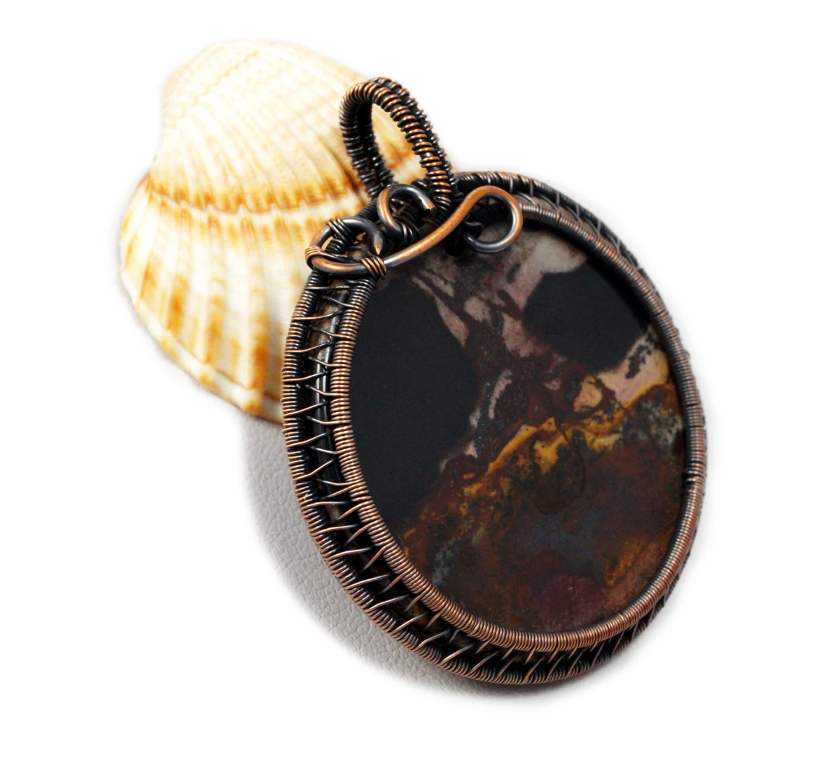 Oryginalny, misternie pleciony wisior  z plastrem jaspisu krajobrazowego w brązowym kolorze.