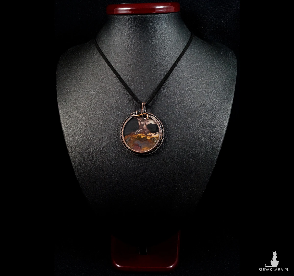 Wisior zaprojektowany i wykonany przeze mnie od podstaw bardzo pracochłonną i precyzyjną techniką wire-wrapping z oksydowanej miedzi.
