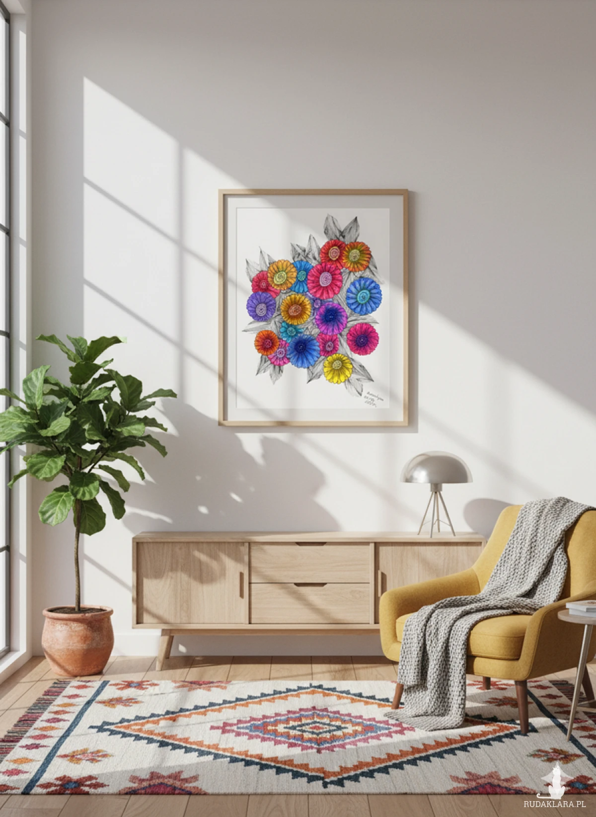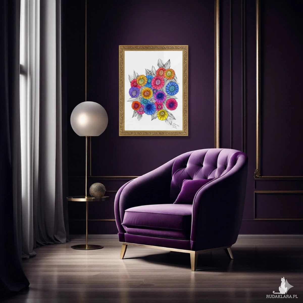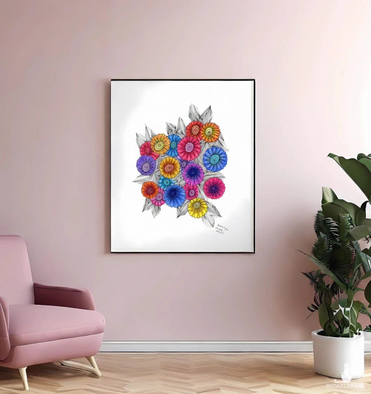 Kwiaty, pękające kolorami tęczy, emanują czystą, nieskrępowaną radością i optymizmem. Ich żywe barwy symbolizują obfitość życia, pozytywne emocje i celebrację różnorodności.