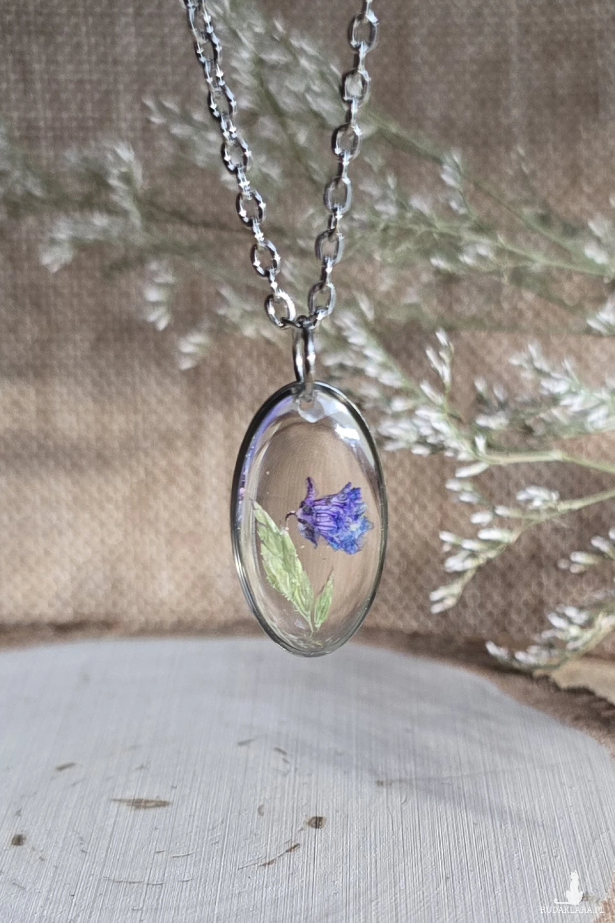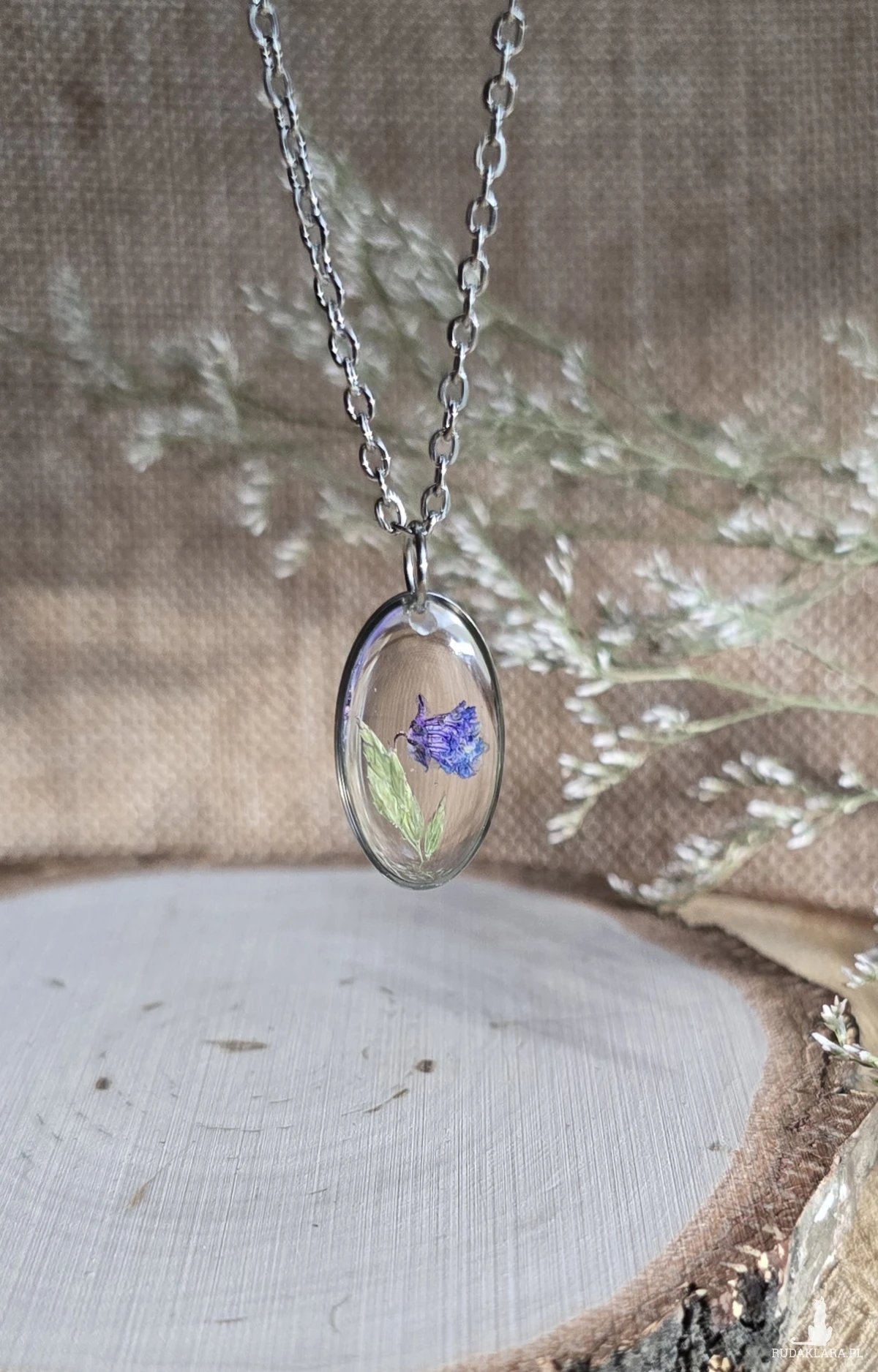 Oferuję Państwu unikalną biżuterię. Zawieszka jest wykonana z suszonych kwiatów i żywicy epoksydowej. Biżuteria jest wspaniałym i oryginalnym prezentem na lata.
