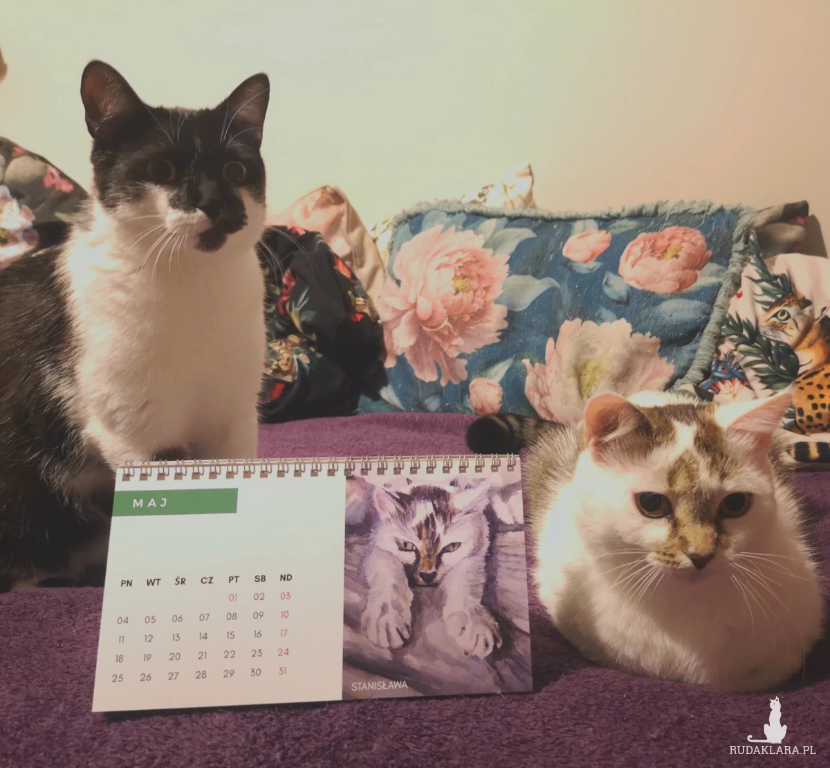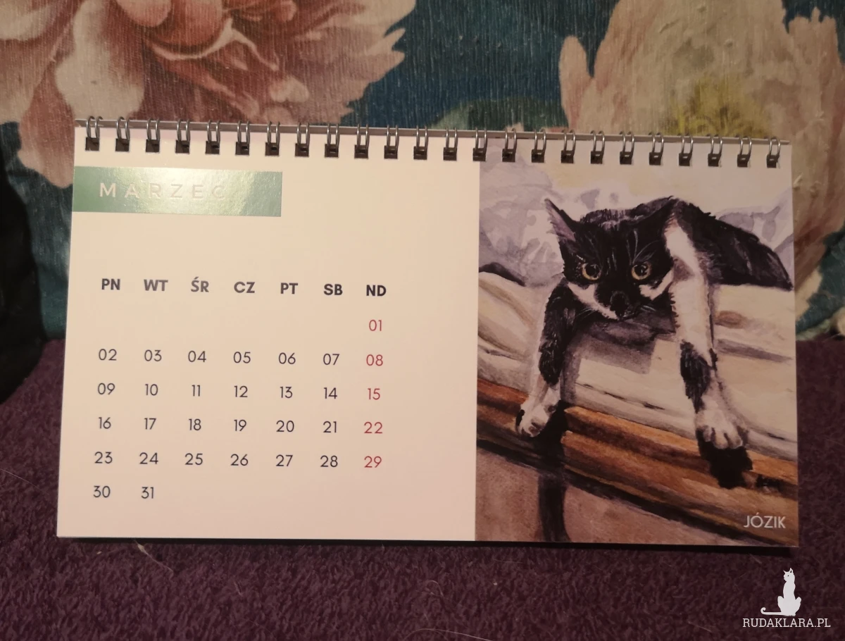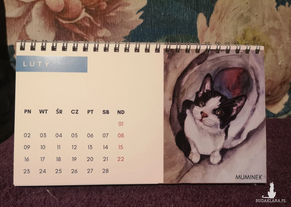 Autorski kalendarz biurkowy z reprodukcjami portretów kotów i psów (moich, moich znajomych oraz z kocich fundacji).