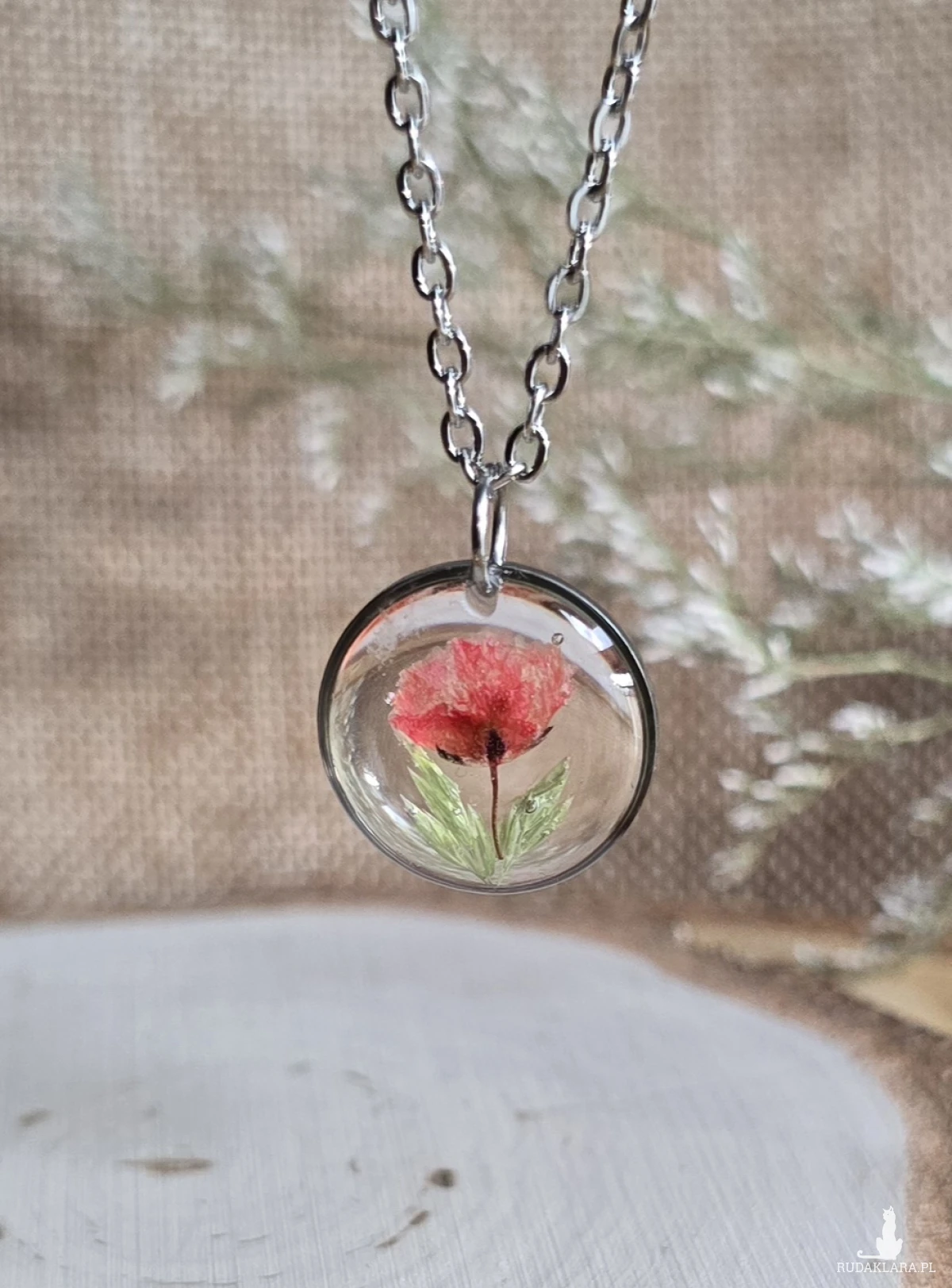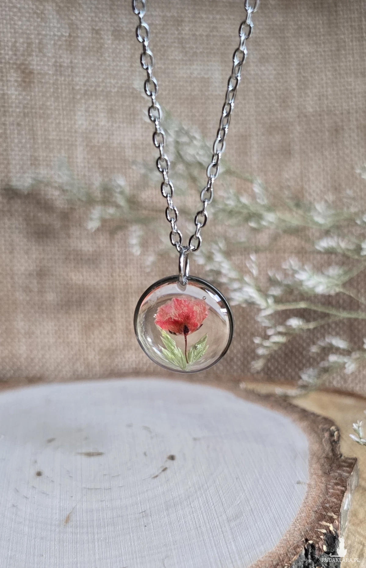 Oferuję Państwu unikalną biżuterię. Zawieszka jest wykonana z suszonych kwiatów i żywicy epoksydowej. Biżuteria jest wspaniałym i oryginalnym prezentem na lata.