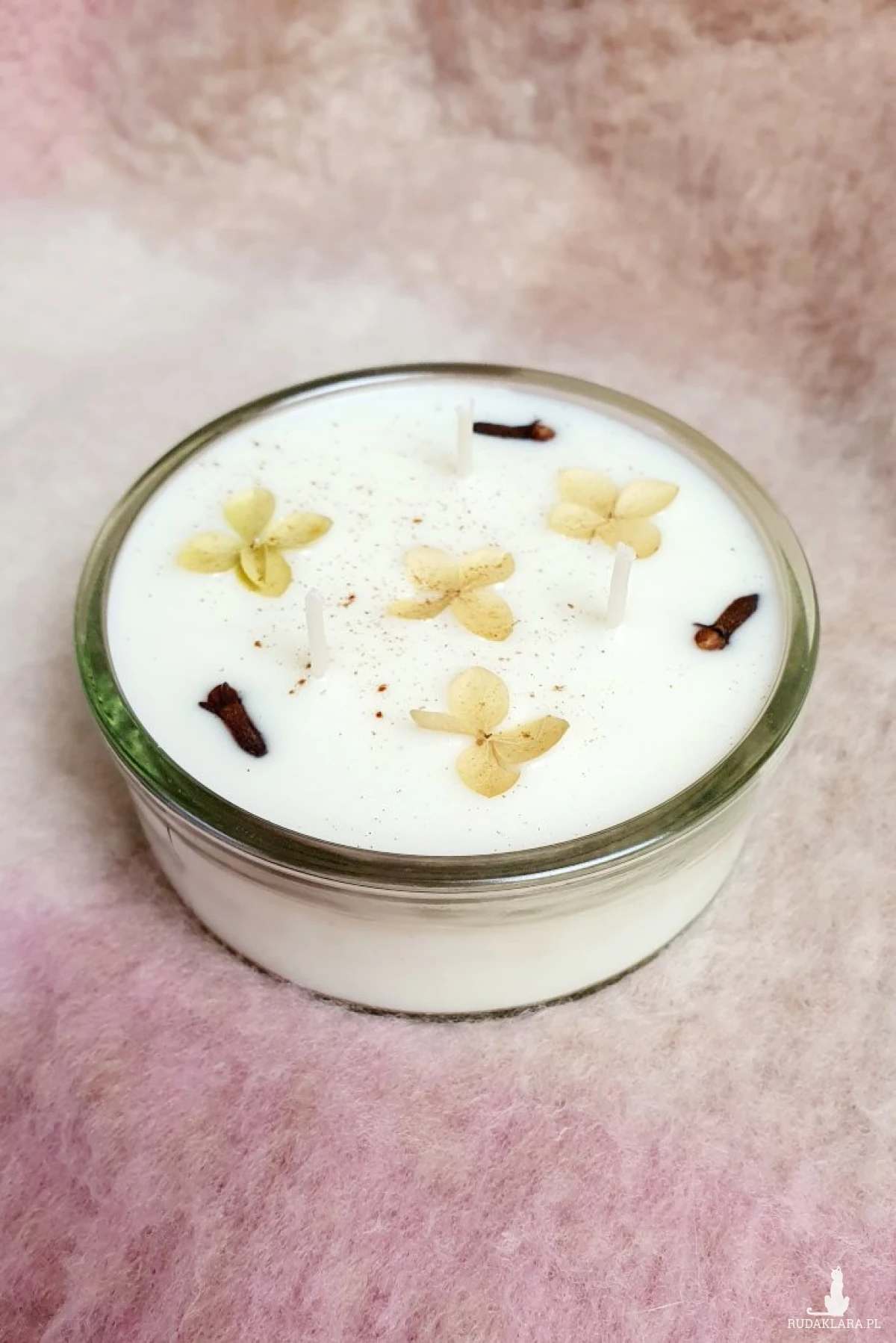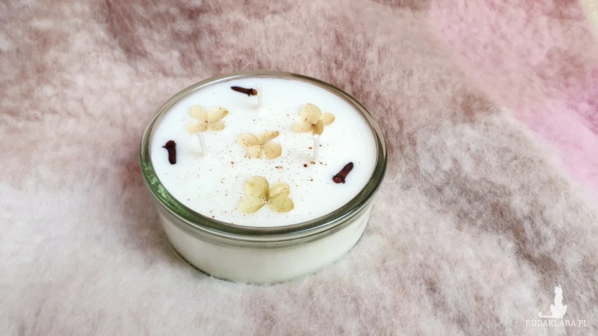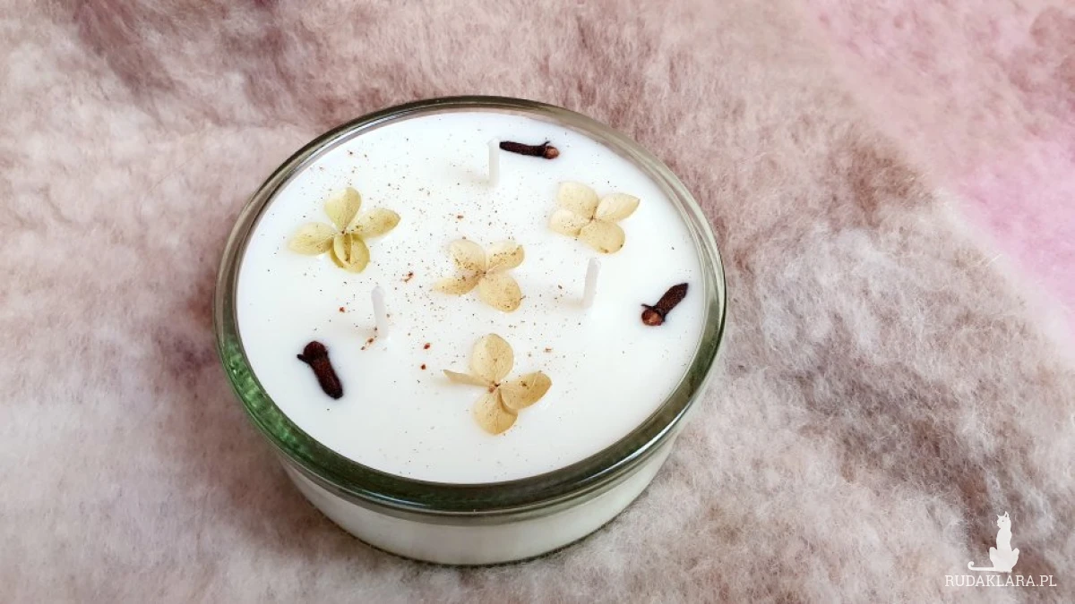 Świeca sojowa wykonana ze 100% wosku sojowego z dodatkiem naturalnego olejku o zapachu goździków z pomarańczą, udekorowana kwiatkami hortensji, cynamonem i goździkami. Lekkie nierówności na wierzchu świecy świadczą o własnoręcznym jej wykonaniu.