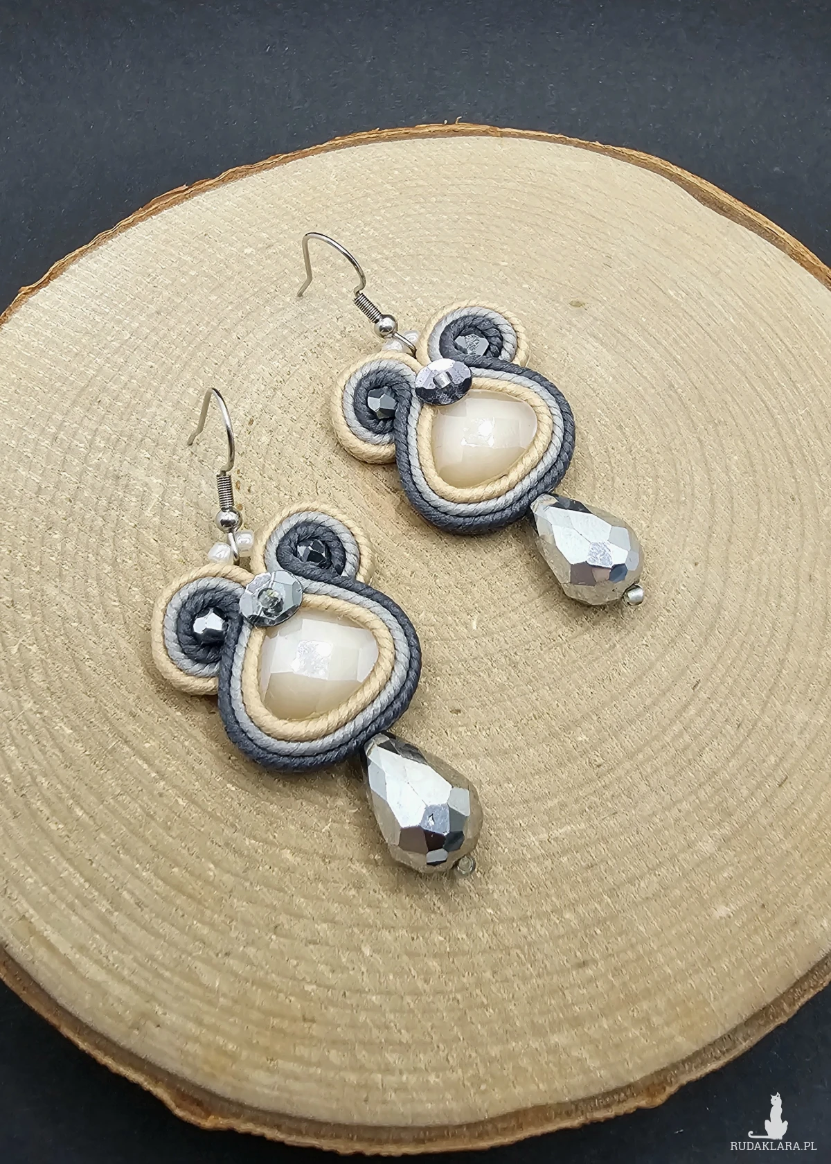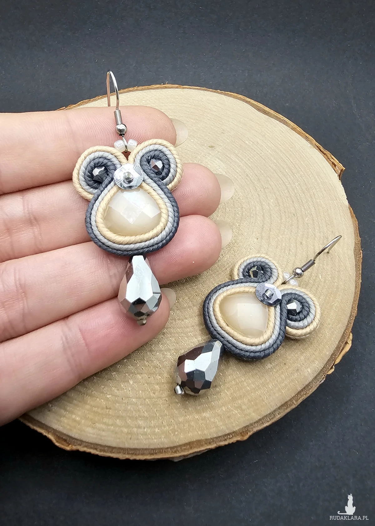 Szklane kryształki otoczone polskimi sznurkami sutasz oraz fasetowanymi koralikami. Dół kolczyków zdobią srebrne krople. Kolczyki zawieszone na klasycznych otwartych biglach ze stali chirurgicznej.