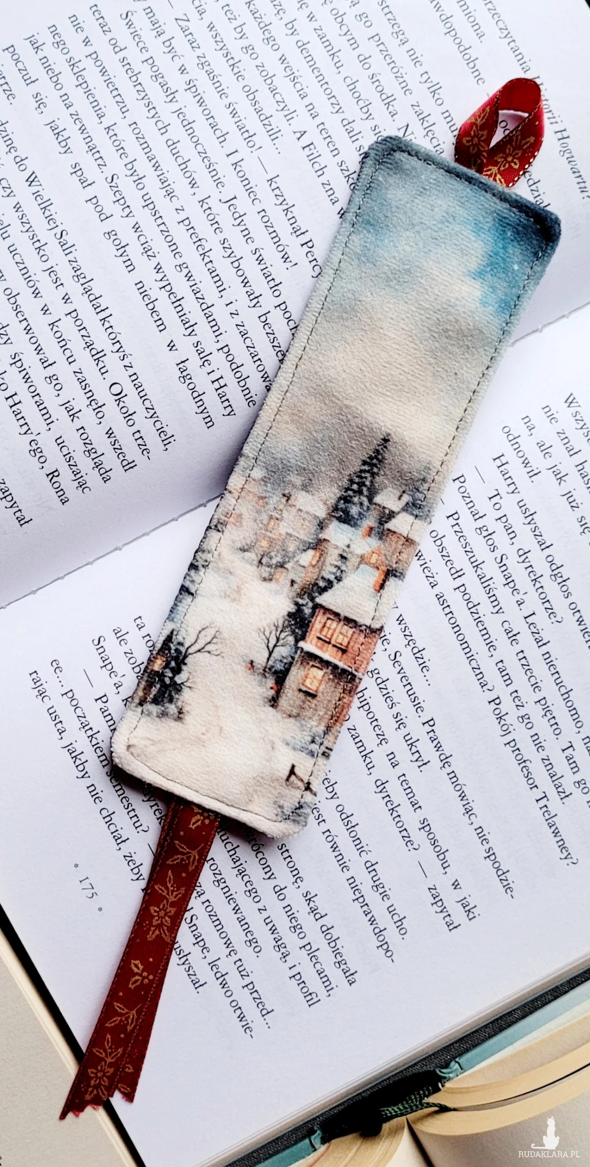Zakładka do książki z zimowym motywem. Wykonana z mięciutkiej tkaniny welurowej oraz grubej bawełny ozdobiona dopasowaną kolorystycznie wstążką. Spełni oczekiwania wszystkich wielbicieli fantastycznych książek.