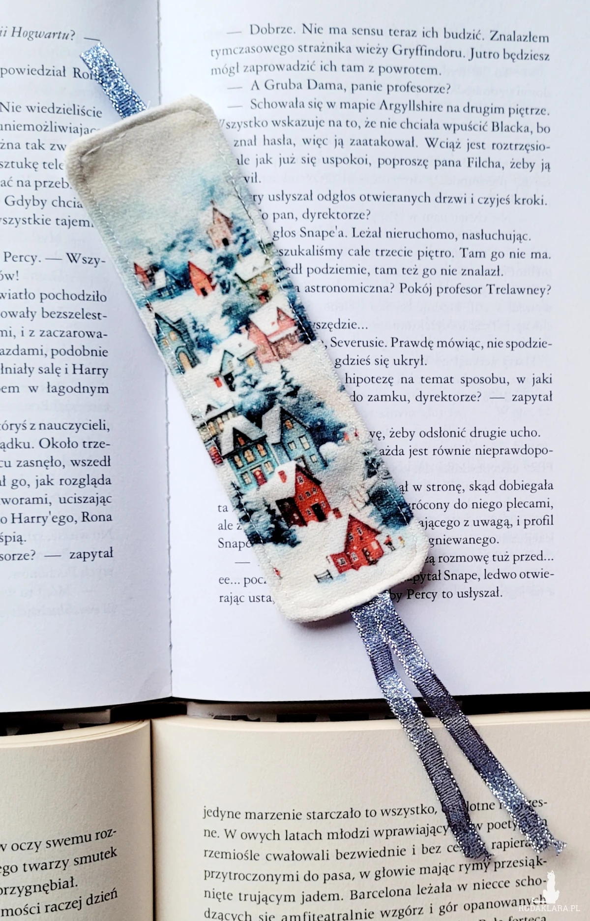 Zakładka do książki z zimowym motywem. Wykonana z mięciutkiej tkaniny welurowej oraz grubej bawełny ozdobiona dopasowaną kolorystycznie wstążką. Spełni oczekiwania wszystkich wielbicieli  fantastycznych książek.