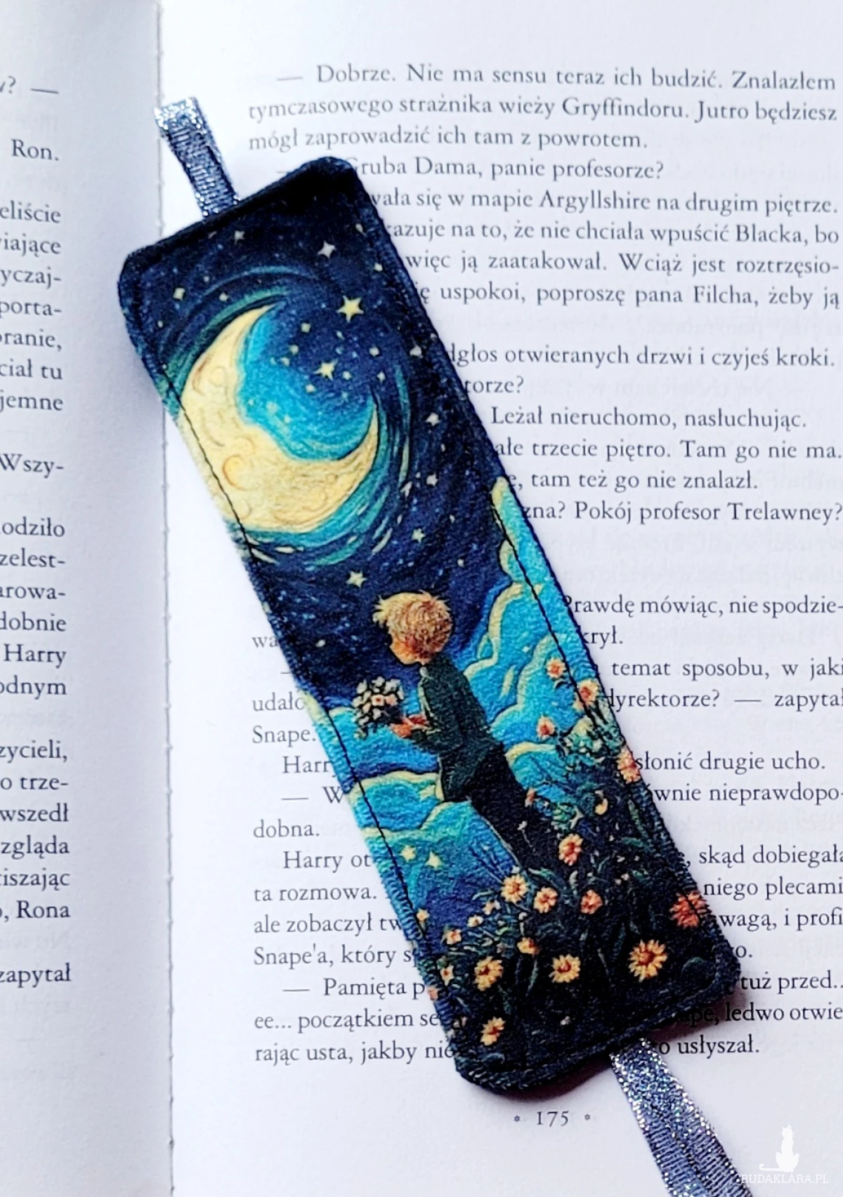 Zakładka do książki z literackim motywem. Wykonana z mięciutkiej tkaniny welurowej oraz grubej bawełny ozdobiona dopasowaną kolorystycznie wstążką. Spełni oczekiwania wszystkich wielbicieli fantastycznych książek.