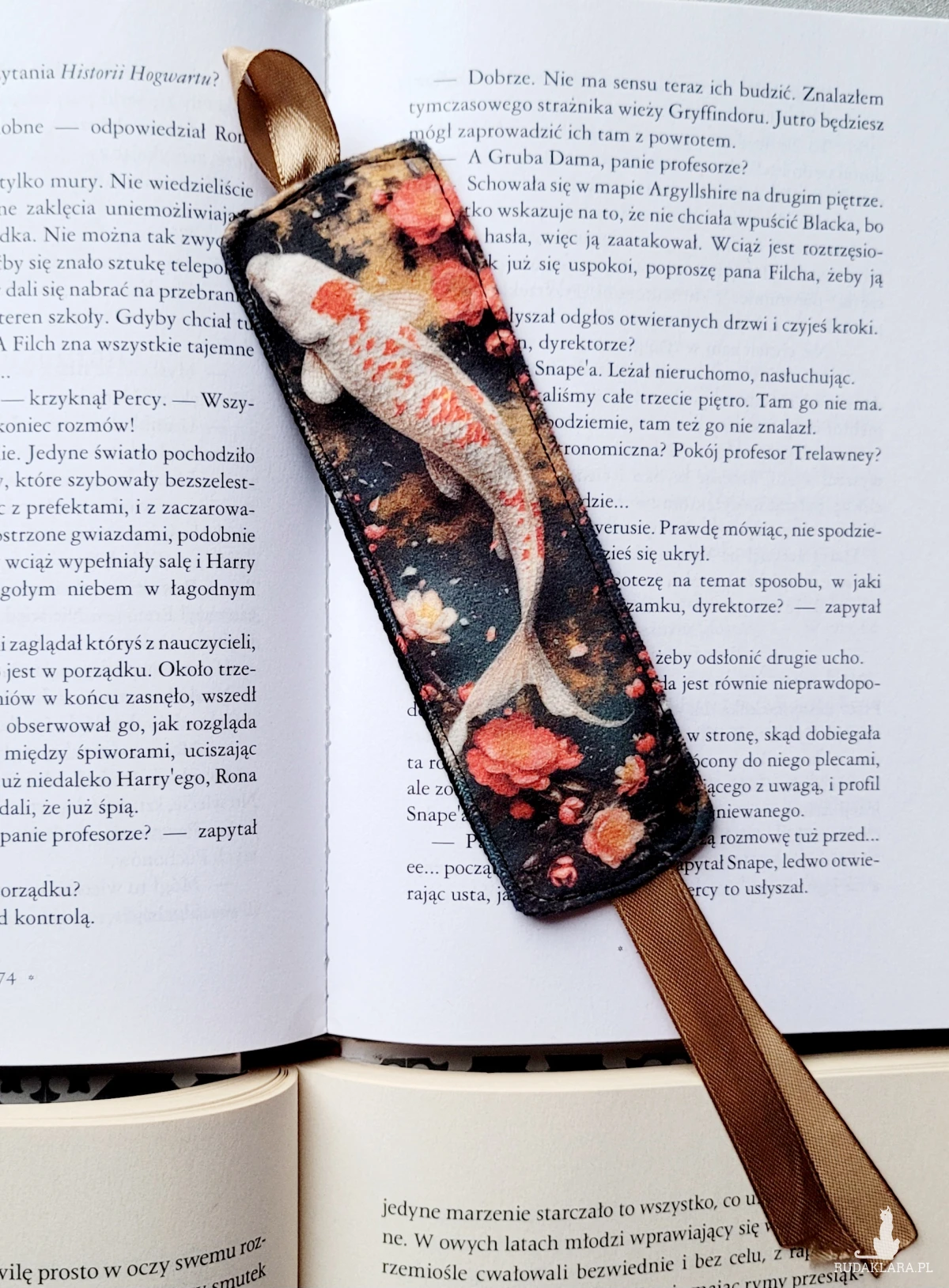 Zakładka do książki z motywem japońskiego karpia koi. Wykonana z mięciutkiej tkaniny welurowej oraz grubej bawełny ozdobiona dopasowaną kolorystycznie wstążką. Spełni oczekiwania wszystkich wielbicieli fantastycznych książek.