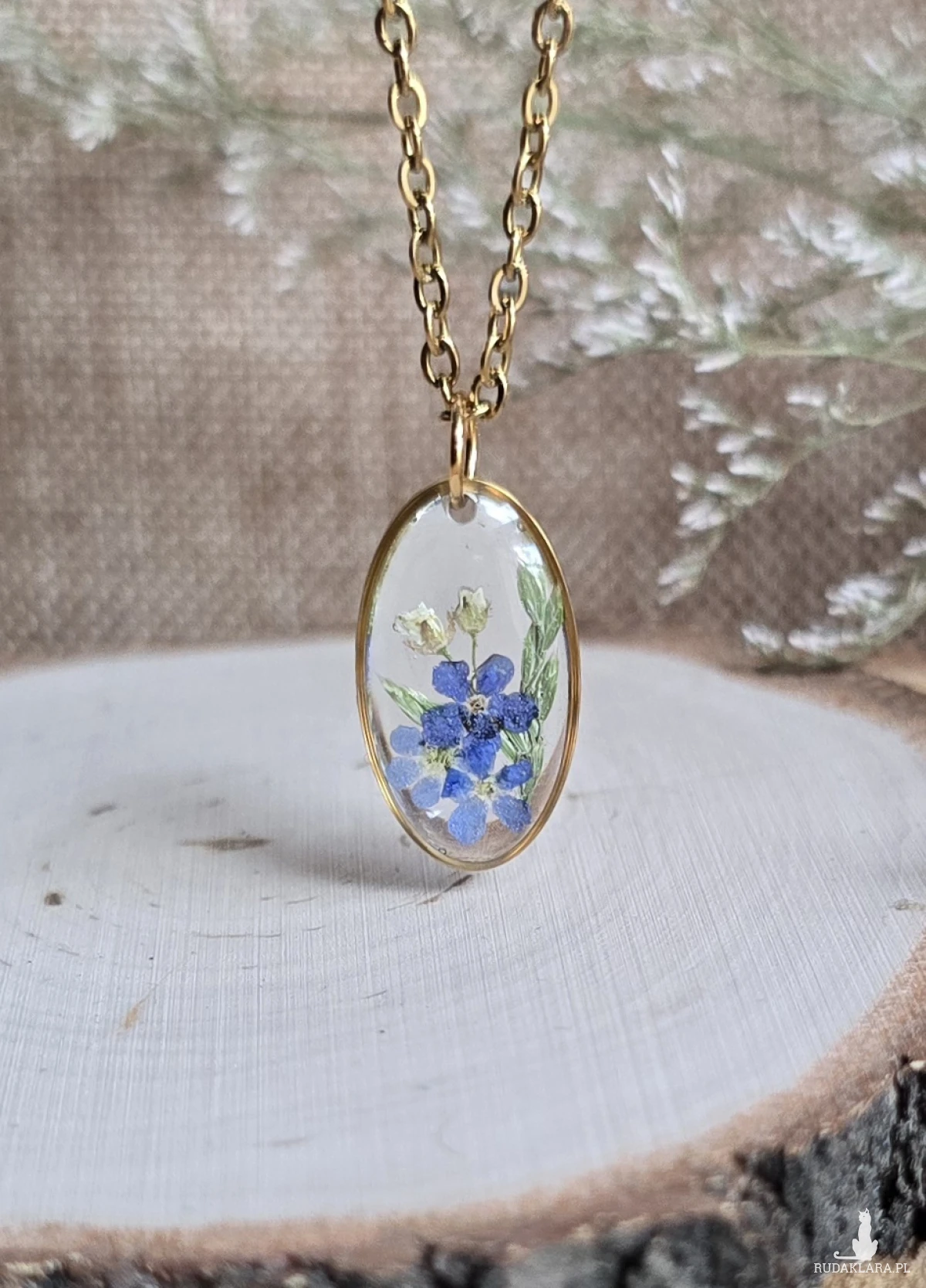 Oferuję Państwu unikalną biżuterię. Zawieszka jest wykonana z suszonych kwiatów i żywicy epoksydowej. Biżuteria jest wspaniałym i oryginalnym prezentem na lata.