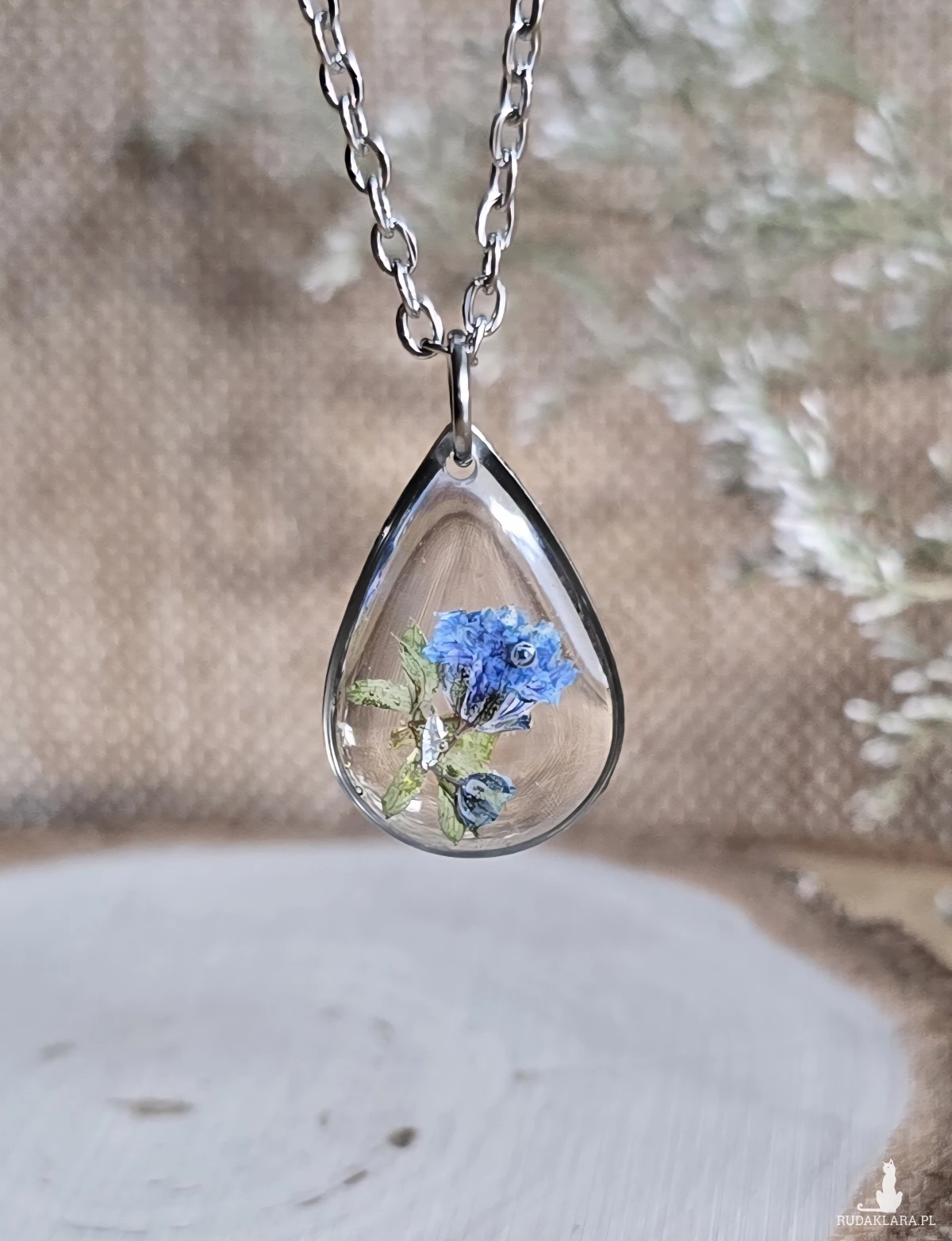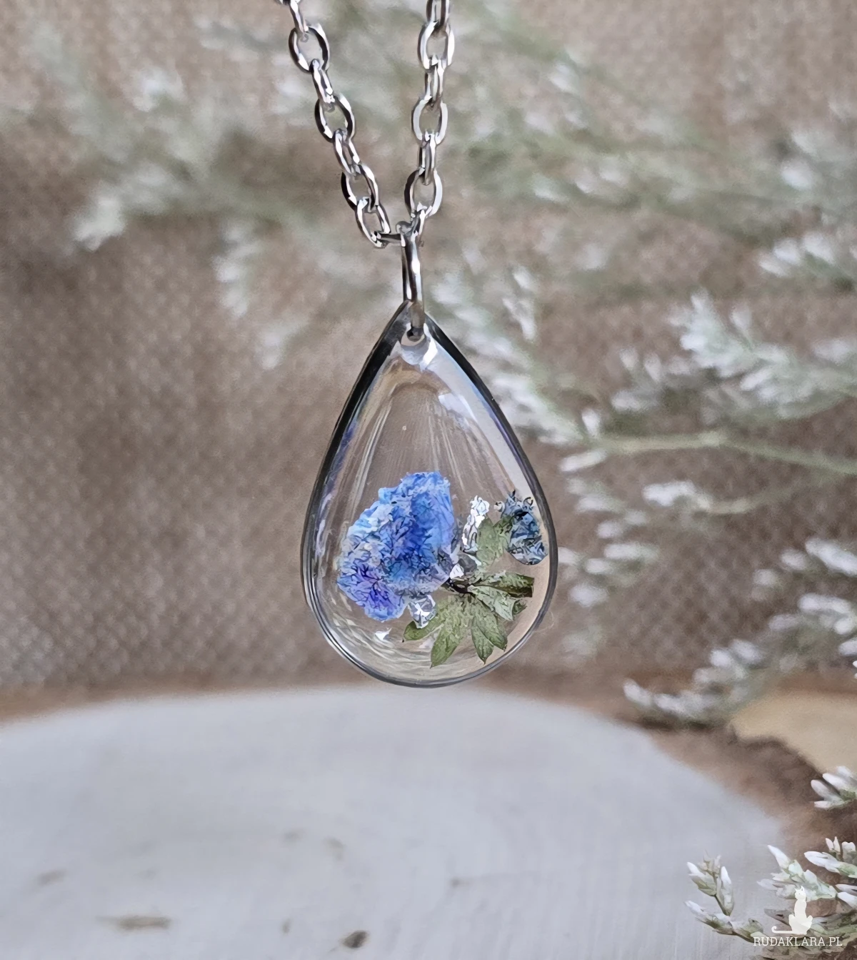 Oferuję Państwu unikalną biżuterię. Zawieszka jest wykonana z suszonych kwiatów i żywicy epoksydowej. Biżuteria jest wspaniałym i oryginalnym prezentem na lata.