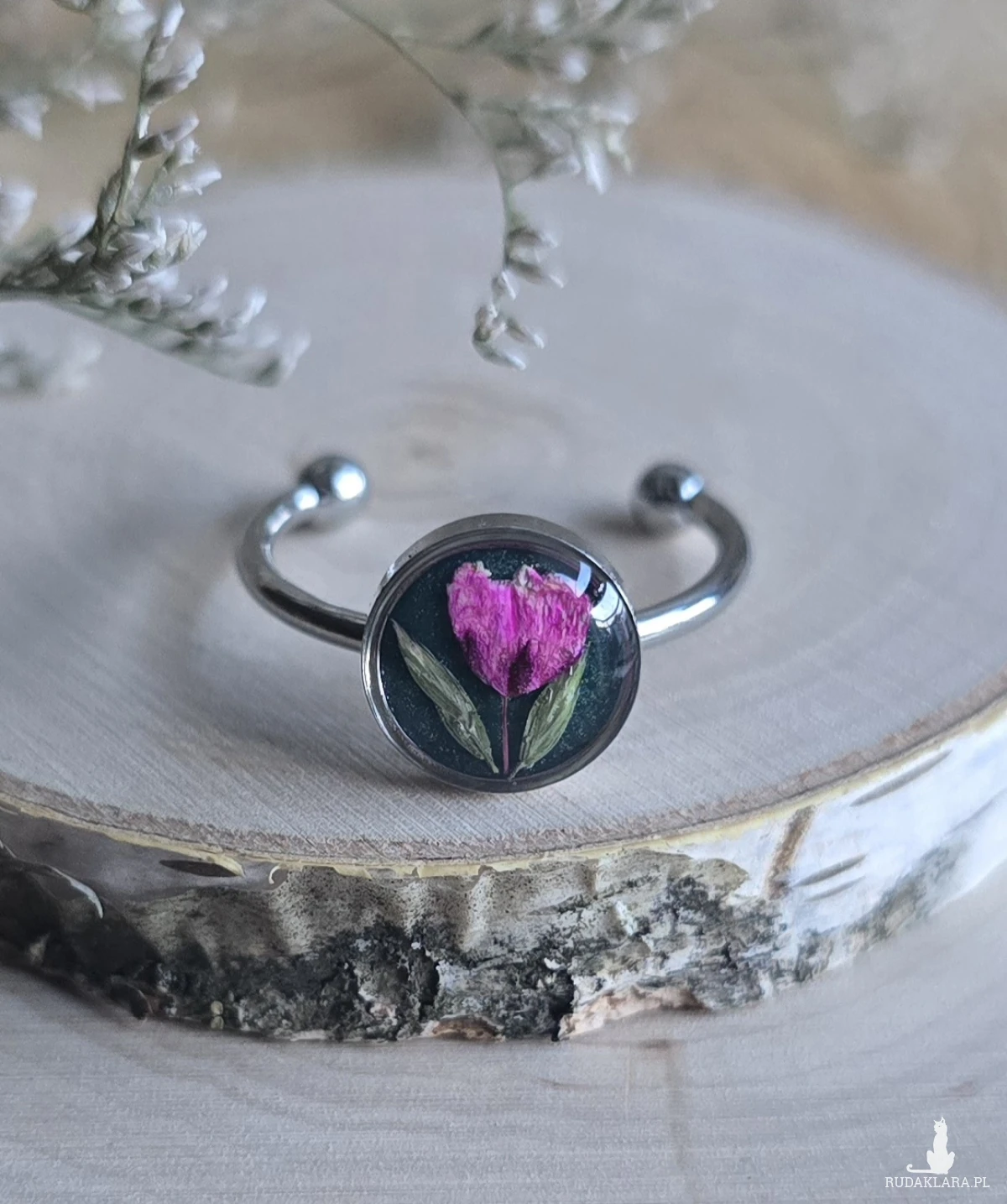 Oferuję Państwu unikalną biżuterię. Pierścionek jest wykonany z suszonych kwiatów i żywicy epoksydowej. Biżuteria jest wspaniałym i oryginalnym prezentem na lata.