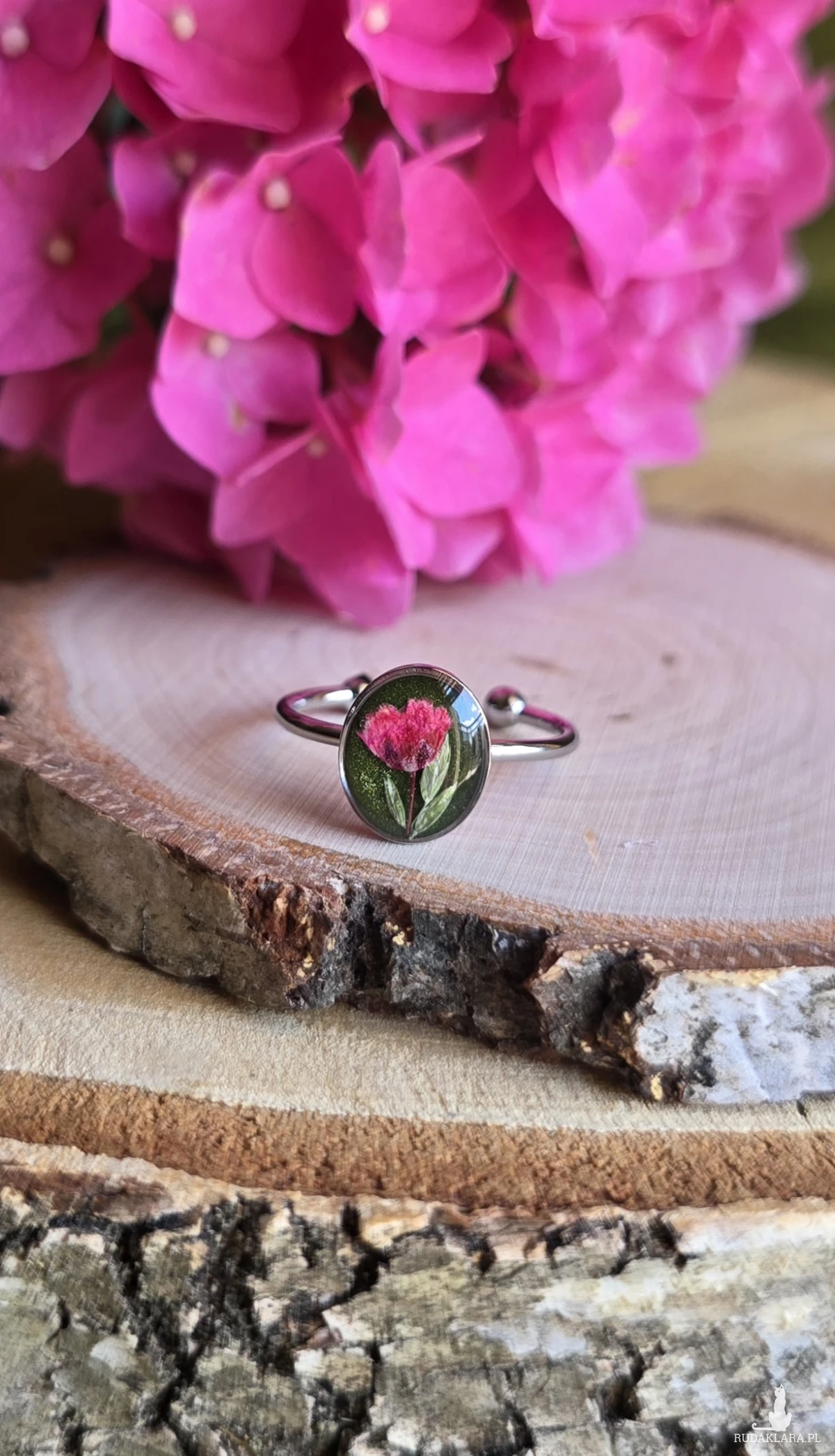 Oferuję Państwu unikalną biżuterię. Pierścionek jest wykonany z suszonych kwiatów i żywicy epoksydowej. Biżuteria jest wspaniałym i oryginalnym prezentem na lata.