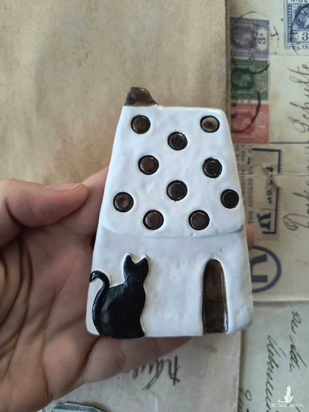 Domek z wiejskiej zagrody wykonany z gliny szamotowej wypalonych na biskwit, a następnie szkliwionych w temperaturze ok 1260 stopni C. Wymiary: 8,5 cm x 5,5 cm. Serdecznie polecam.