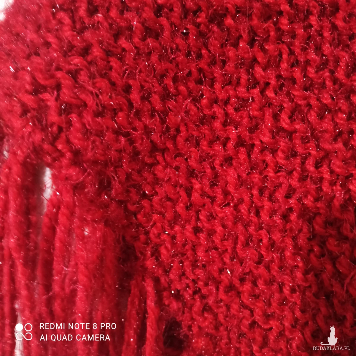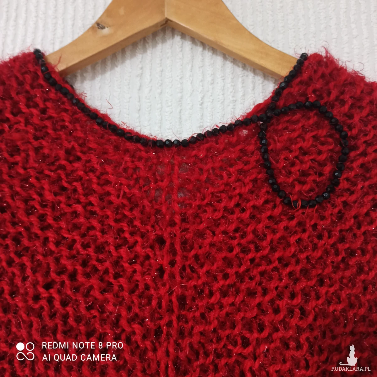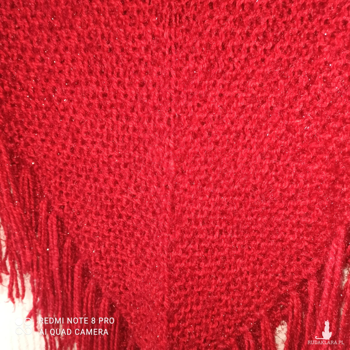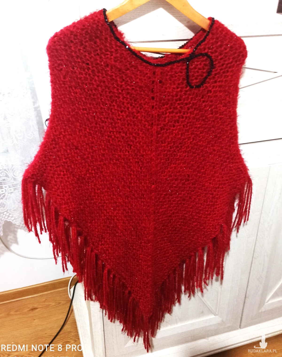 Piękne ponczo wykonane z przemiłej w dotyku wełny w kolorze karminowym. Nie gryzie. Ponczo przy szyi ozdobione czarnymi koralikami. Przy świetle widoczna nitka połyskująca miejscowo jakby kryształkami. U dołu ponczo wzbogacone długimi frędzlami 16 cm. Wełna podatna na układanie się tak do szczupłej jaki niekoniecznie szczupłej osoby. Wyrób dla dorosłej osoby. Wykonany na drutach z wełny. Bardzo dekoracyjne, wyjątkowo piękne, eleganckie, estetycznie wykonane. Przyciąga wzrok, dodaje klasy. Dobrze przepuszcza powietrze. Pranie ręczne. Polecam!