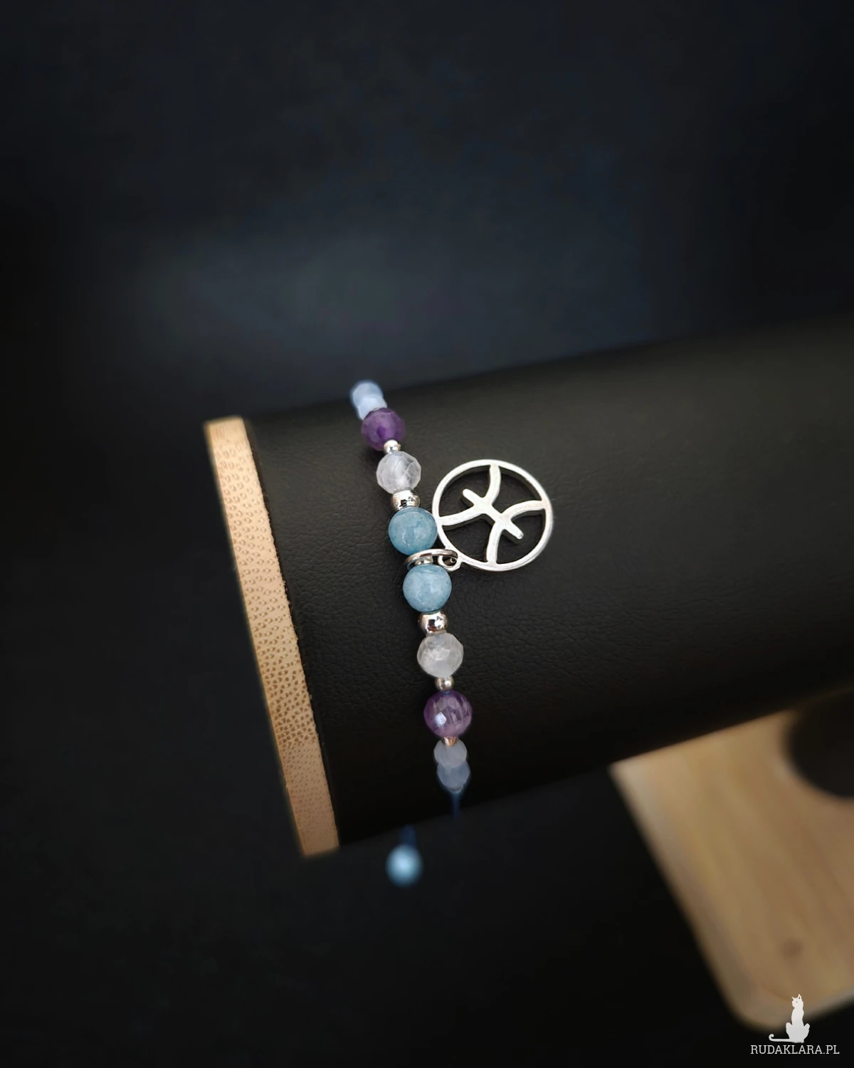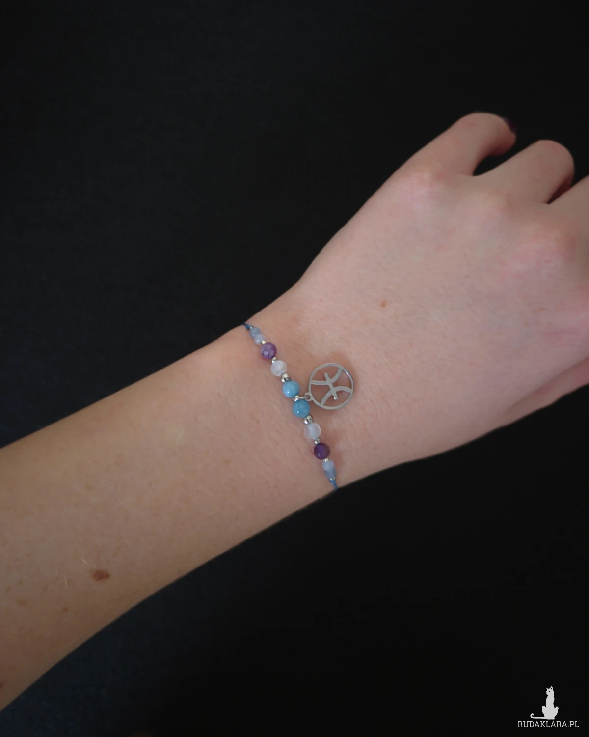 Bransoletka Zodiakalna „Ryby” to subtelna, harmonijna kompozycja stworzona z myślą o osobach urodzonych pod znakiem Ryb — wrażliwych, intuicyjnych, empatycznych i głęboko połączonych ze światem emocji. Delikatna kolorystyka fioletu, błękitu i mlecznej bieli przywodzi na myśl spokój wody, ciszę i wewnętrzną równowagę. Całość dopełniają srebrne akcenty oraz zawieszka z symbolem Ryb, czyniąc z bransoletki osobisty talizman wspierający emocje i duchowość.
