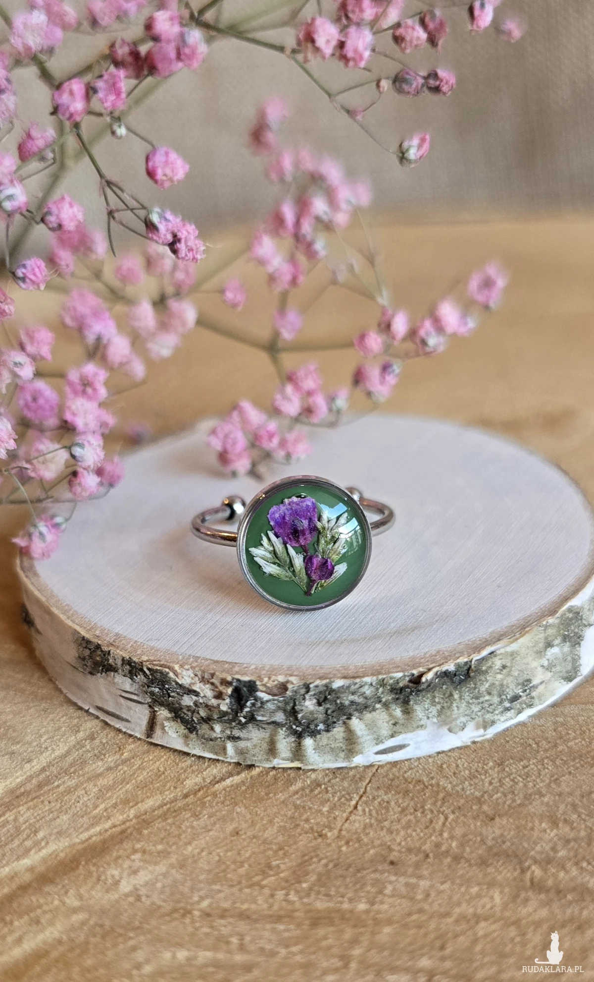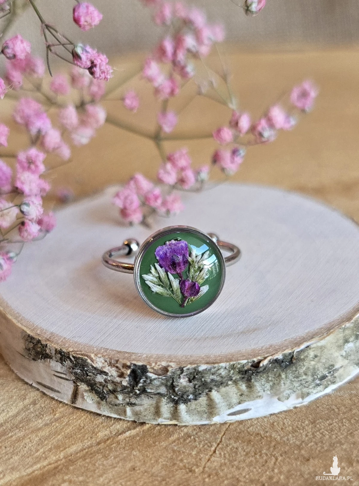 Oferuję Państwu unikalną biżuterię. Pierścionek jest wykonany z suszonych kwiatów i żywicy epoksydowej. Biżuteria jest wspaniałym i oryginalnym prezentem na lata.