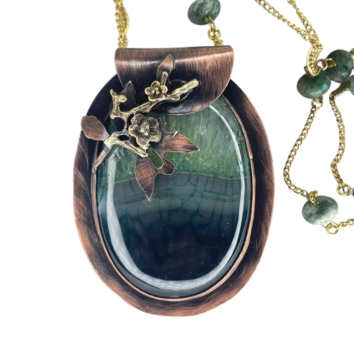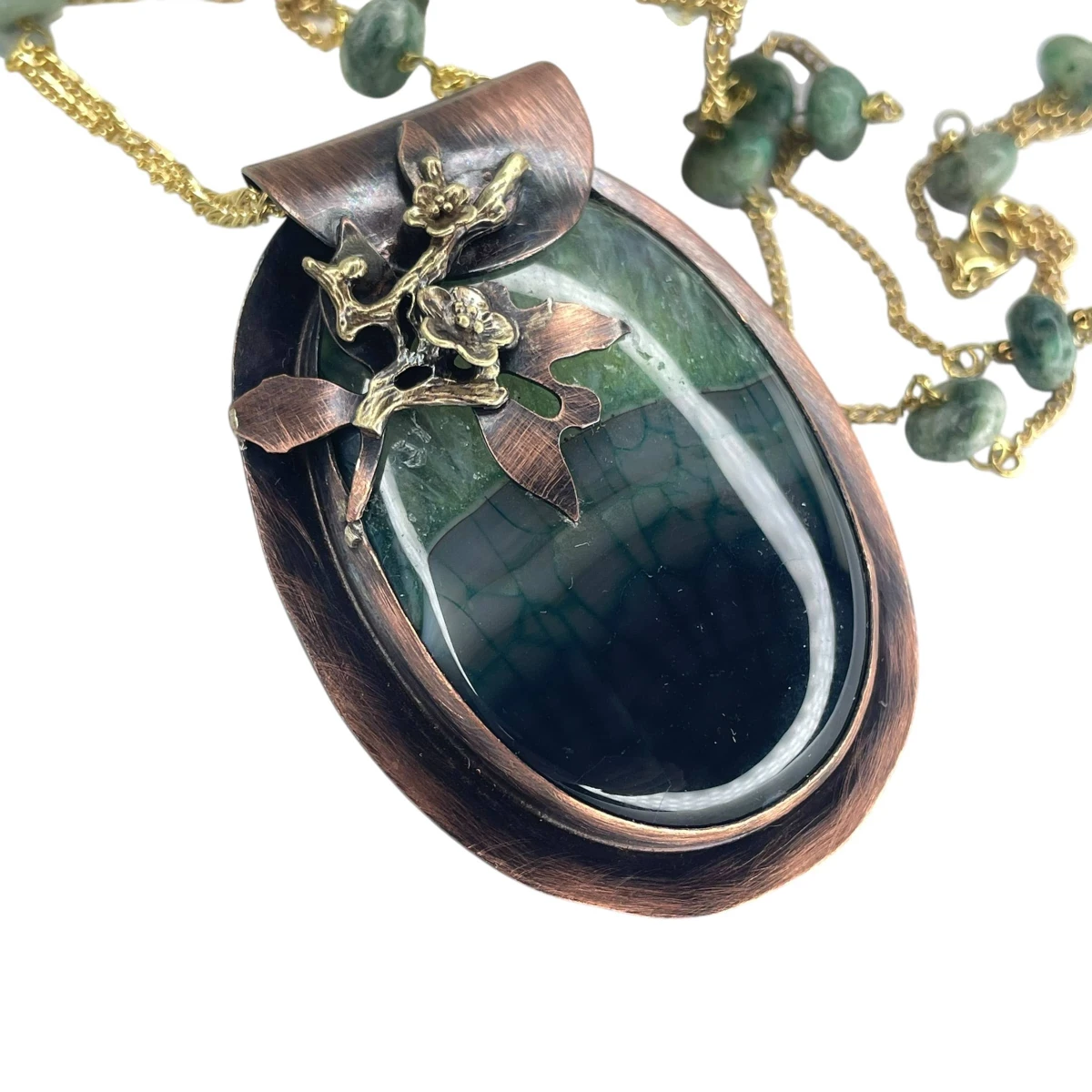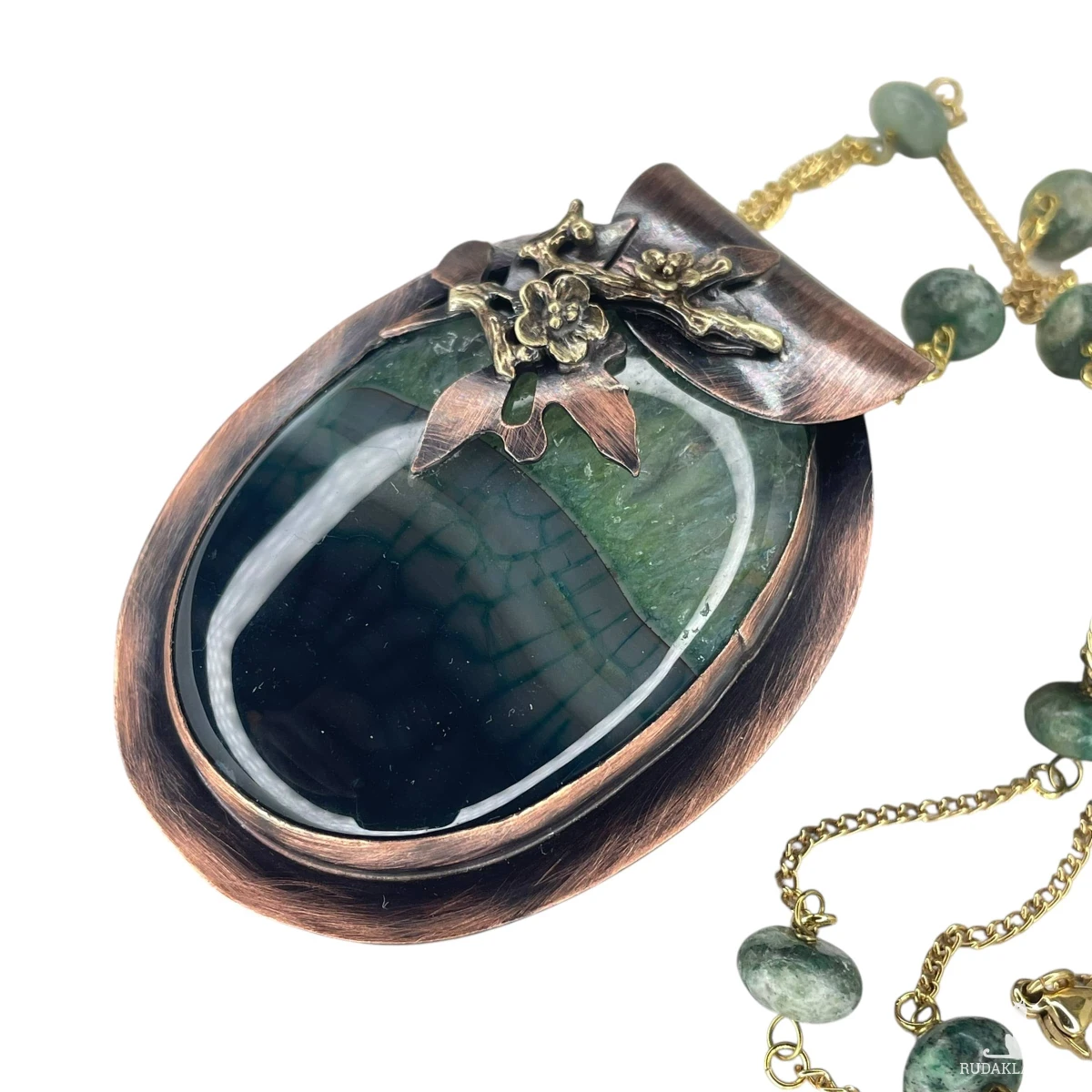 Głęboka zieleń agatu pięknie współgra z patynowaną miedzią, tworząc kompozycję, która przywołuje skojarzenia z bujną roślinnością, wilgotnymi liśćmi i światłem przebijającym przez korony drzew. Naszyjnik zawieszono na łańcuszku ze stali chirurgicznej w złotym odcieniu, przeplatanym drobnymi jaspisami, co dodatkowo podkreśla jego naturalny, roślinny charakter.