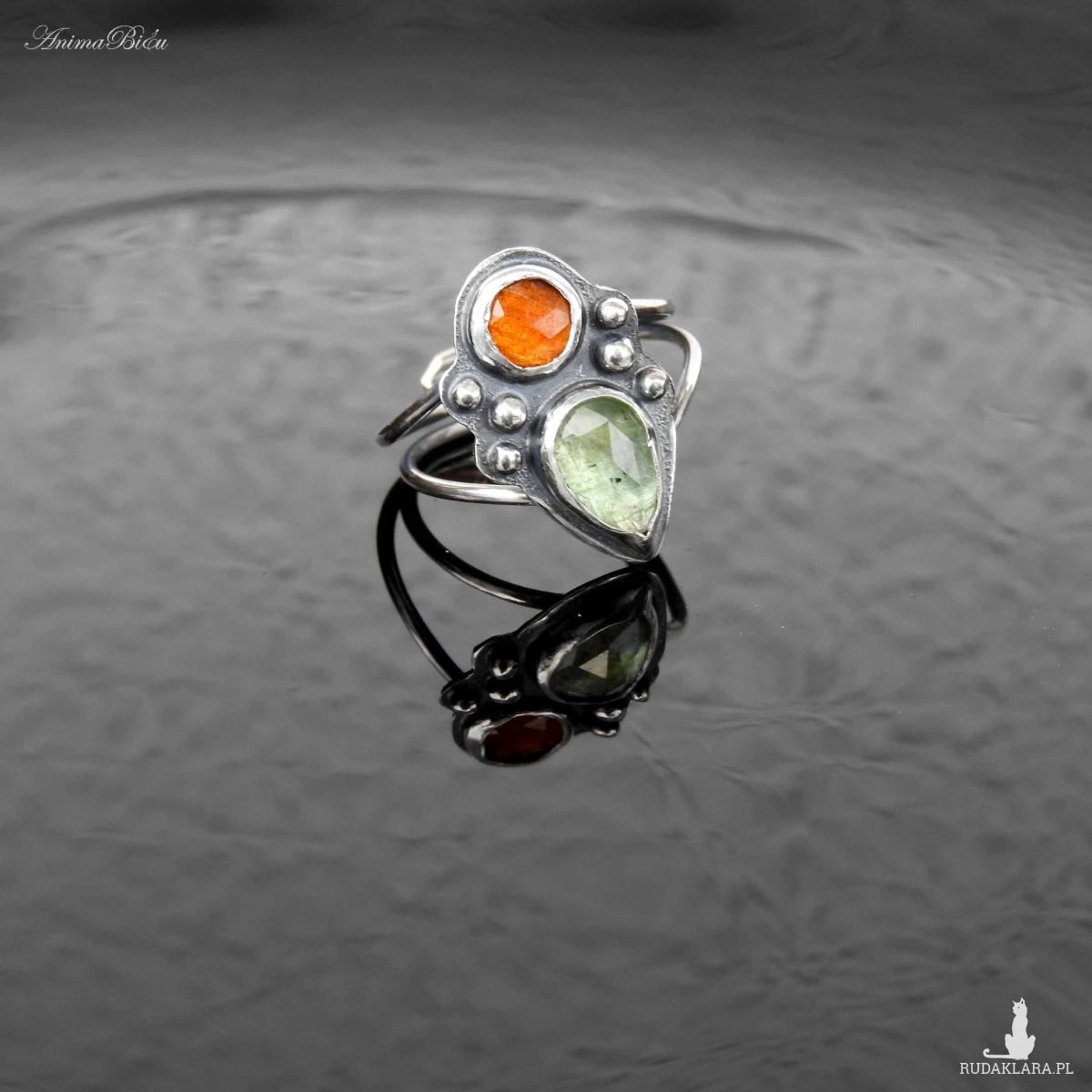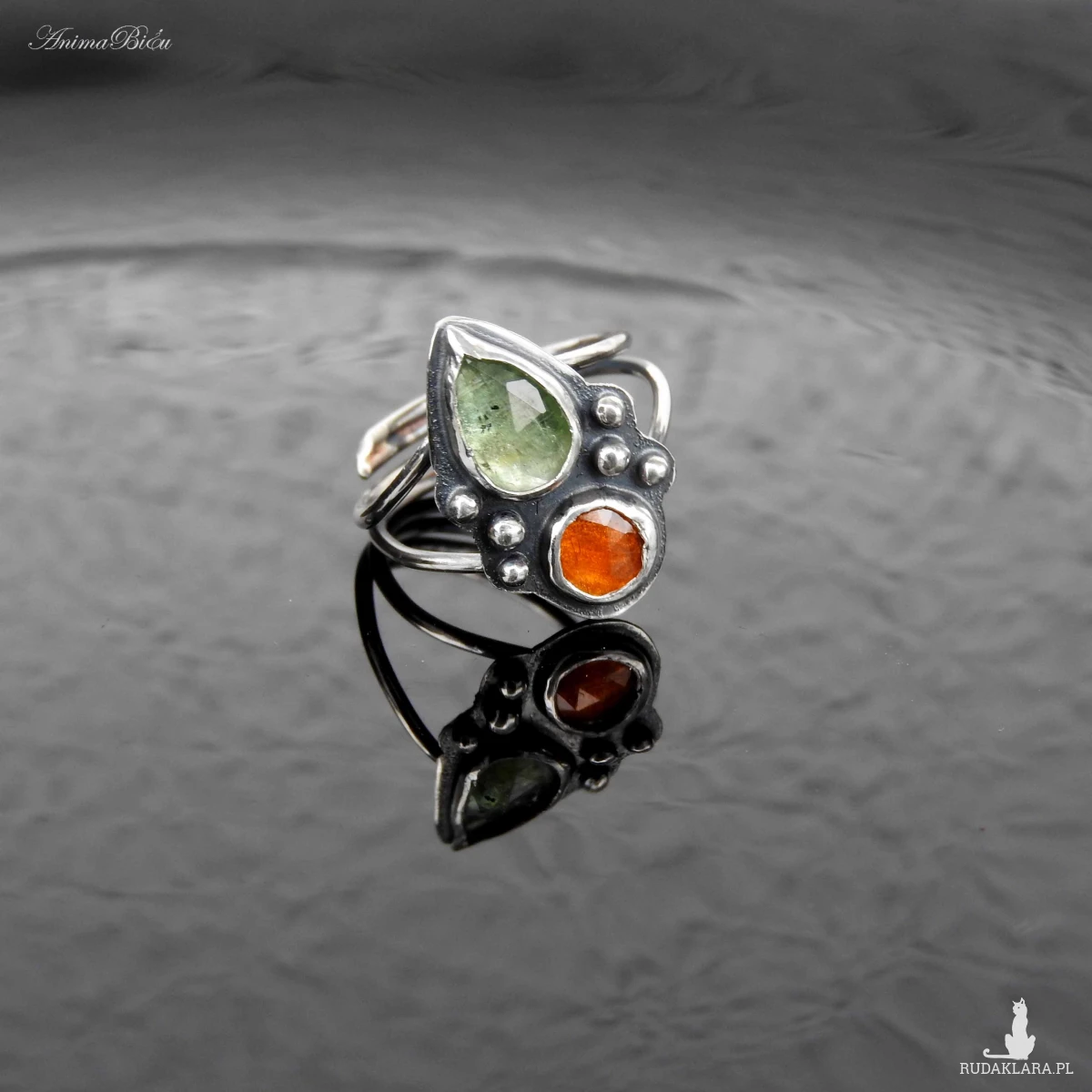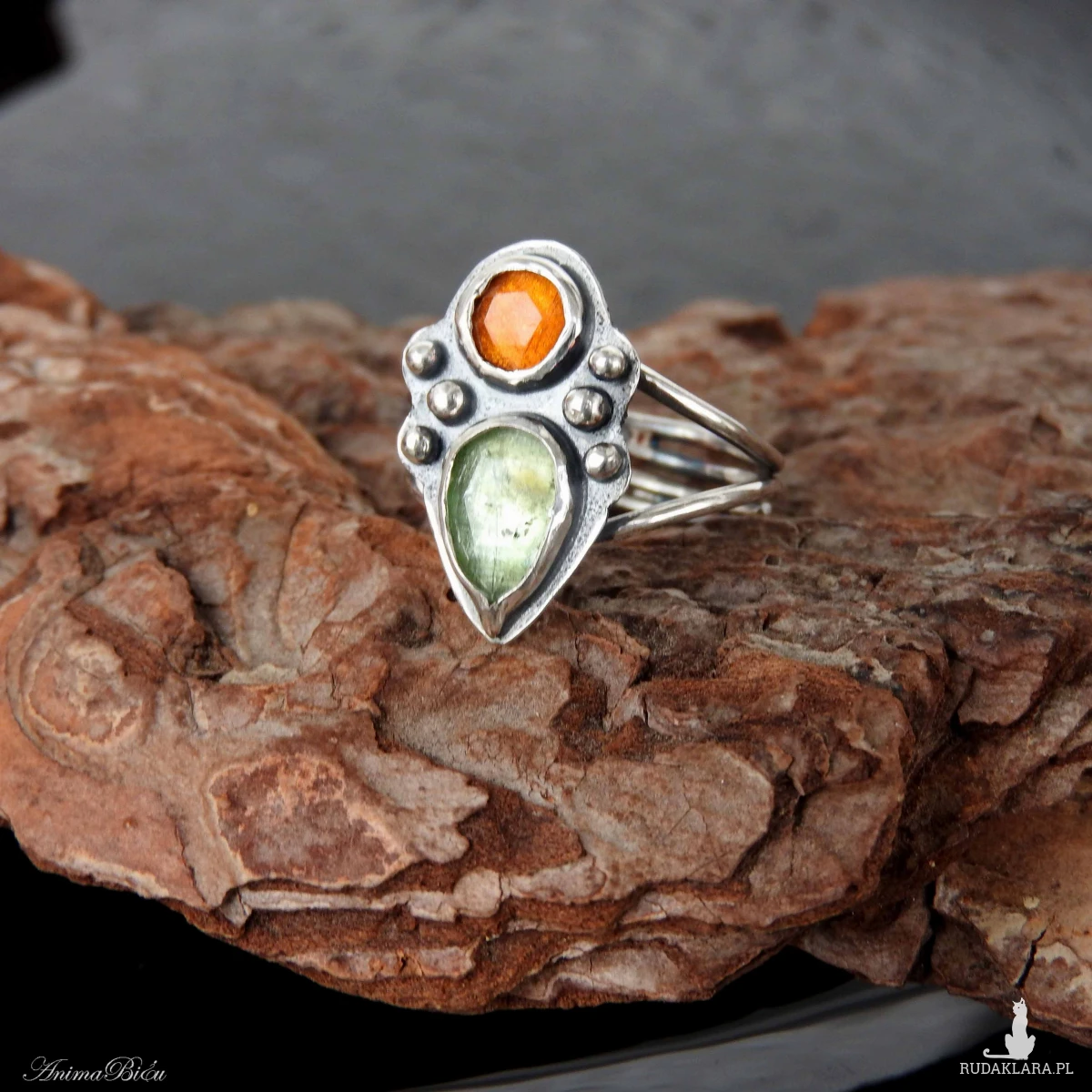 Pierścionek srebrny z zielonym i pomarańczowym kyanitem.