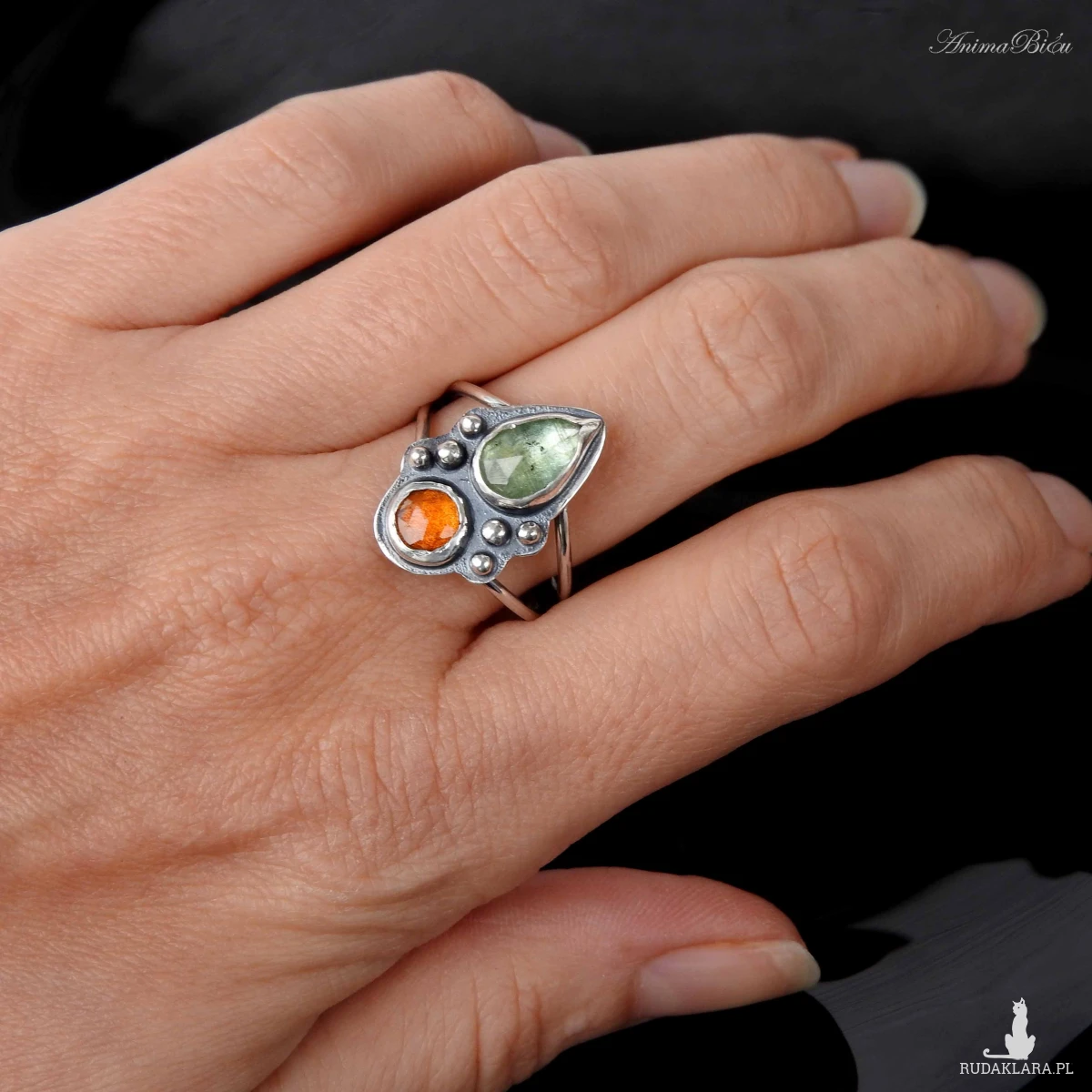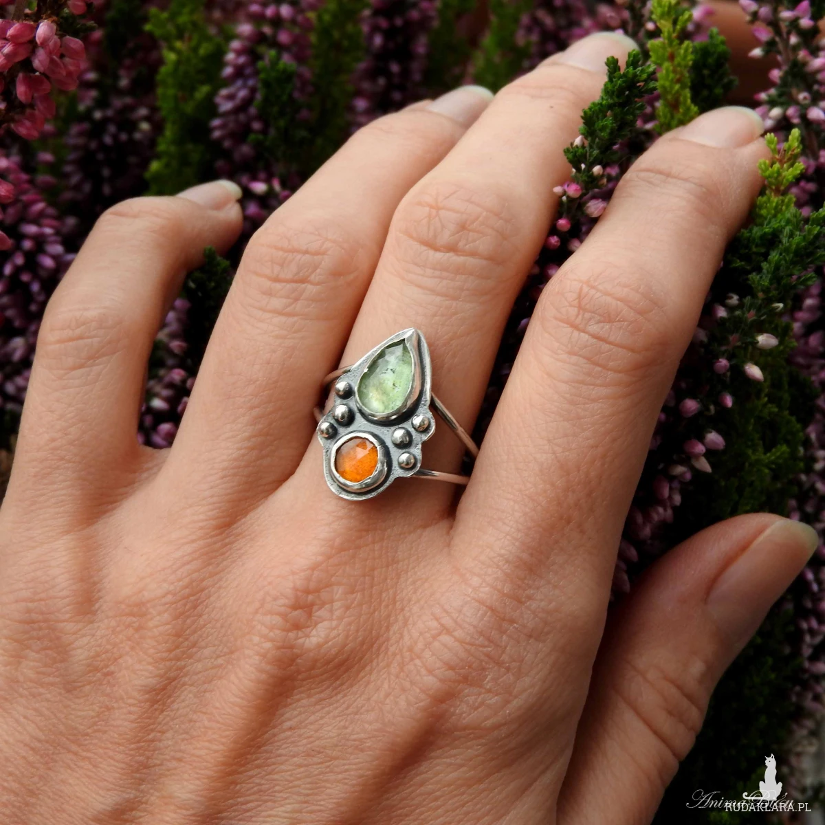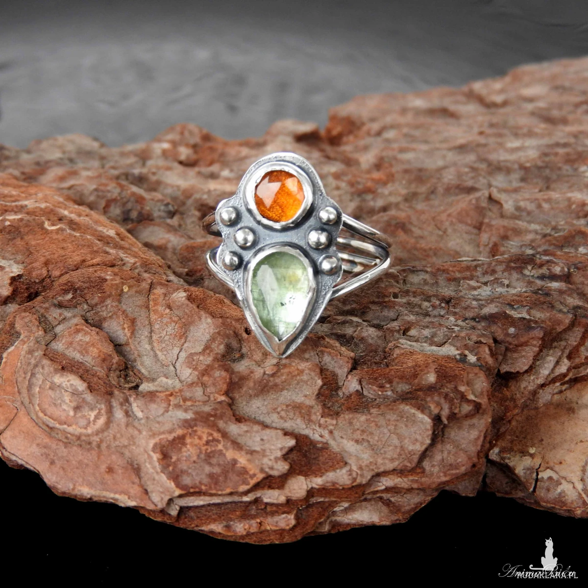 Pierścionek srebrny z zielonym i pomarańczowym kyanitem.
