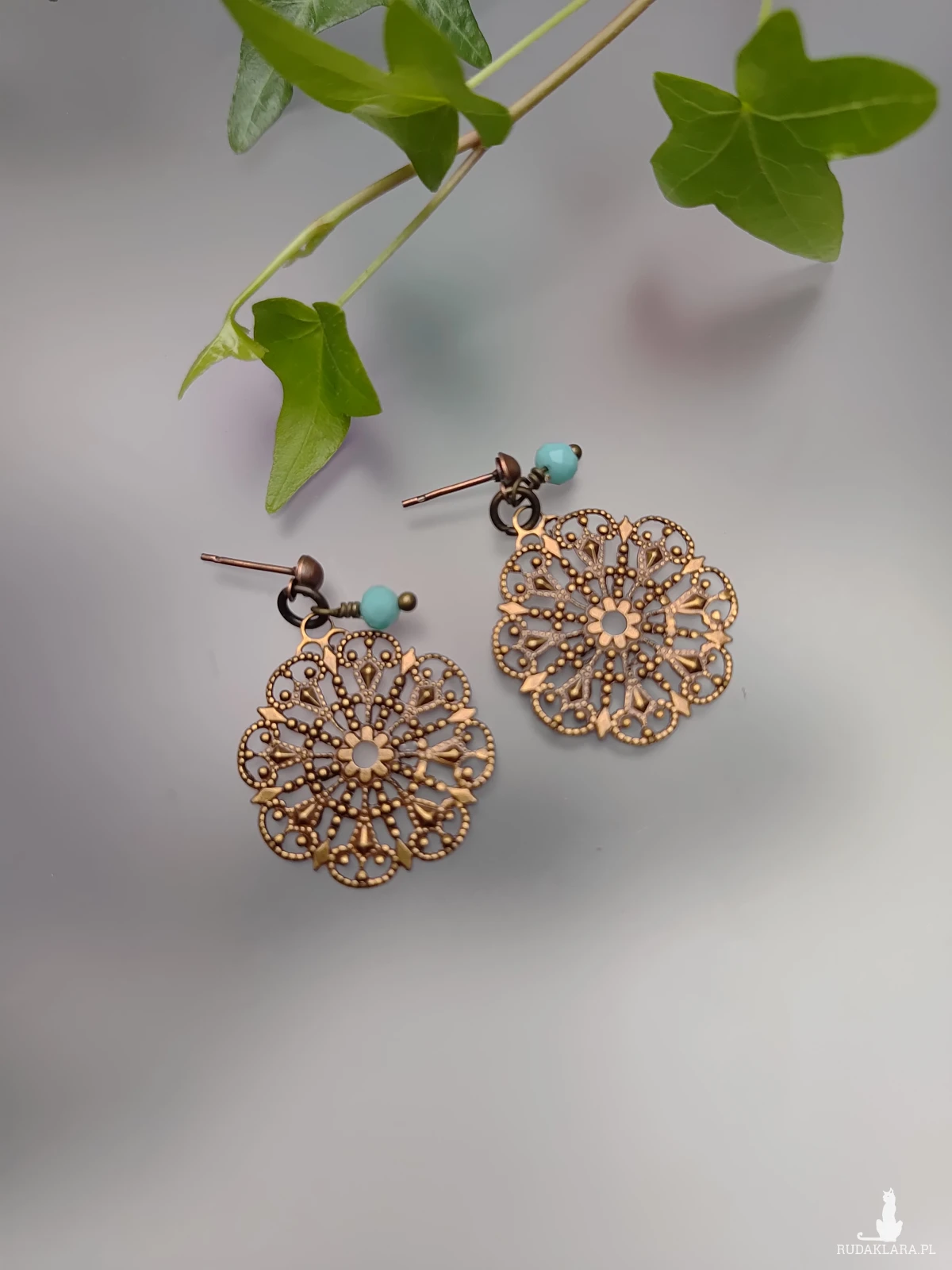 Kolczyki z mosiężnych filigranów w kształcie małych mandali. Średnica mandali 2,5 cm, sztyft metalowy w kolorze miedzi, Długość z biglem 3 cm, szklany koralik w kolorze turkusowym, do sztyftów baranki silikonowe