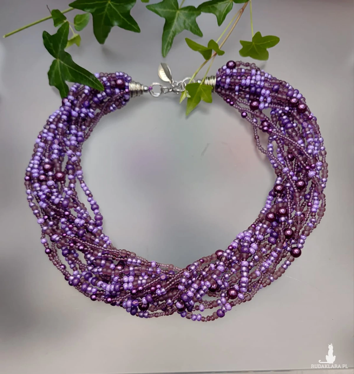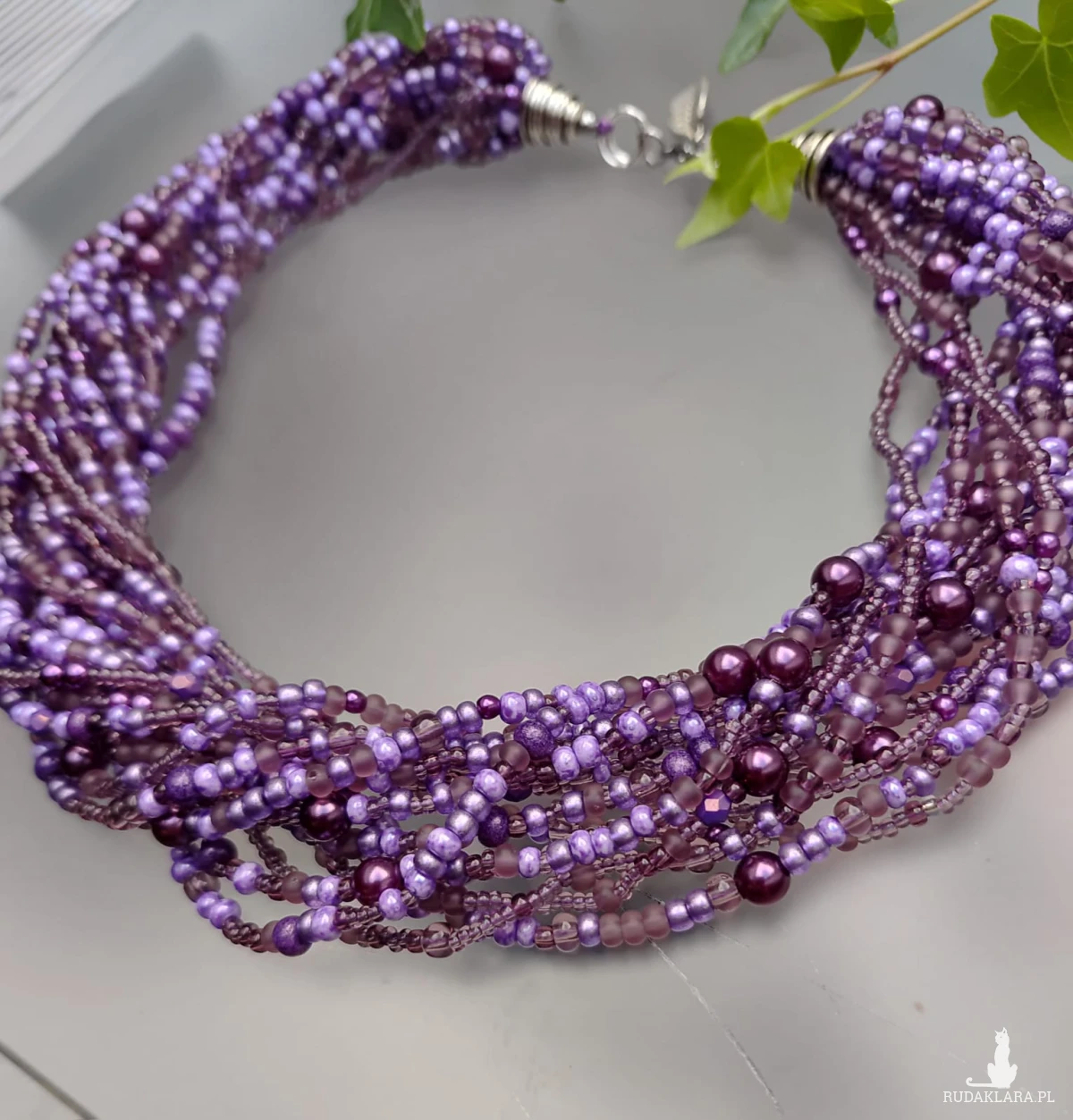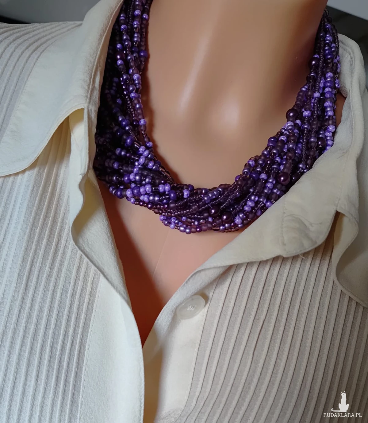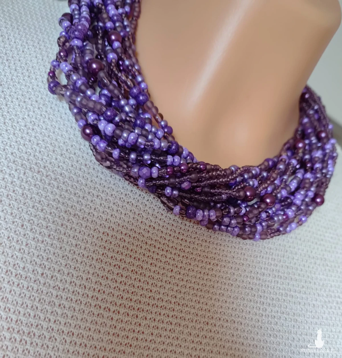 Naszyjnik, korale perłowe kuleczki szklane i drobne różnej wielkości koraliki okrągłe w odcieniach koloru fioletowego. Całość piękna, elegancka. Idealne na przyjęcie, ale również w codziennych stylizacjach. Metalowe wykończenie kapturkami i stalowe zapięcie. Objętość korali 46 cm