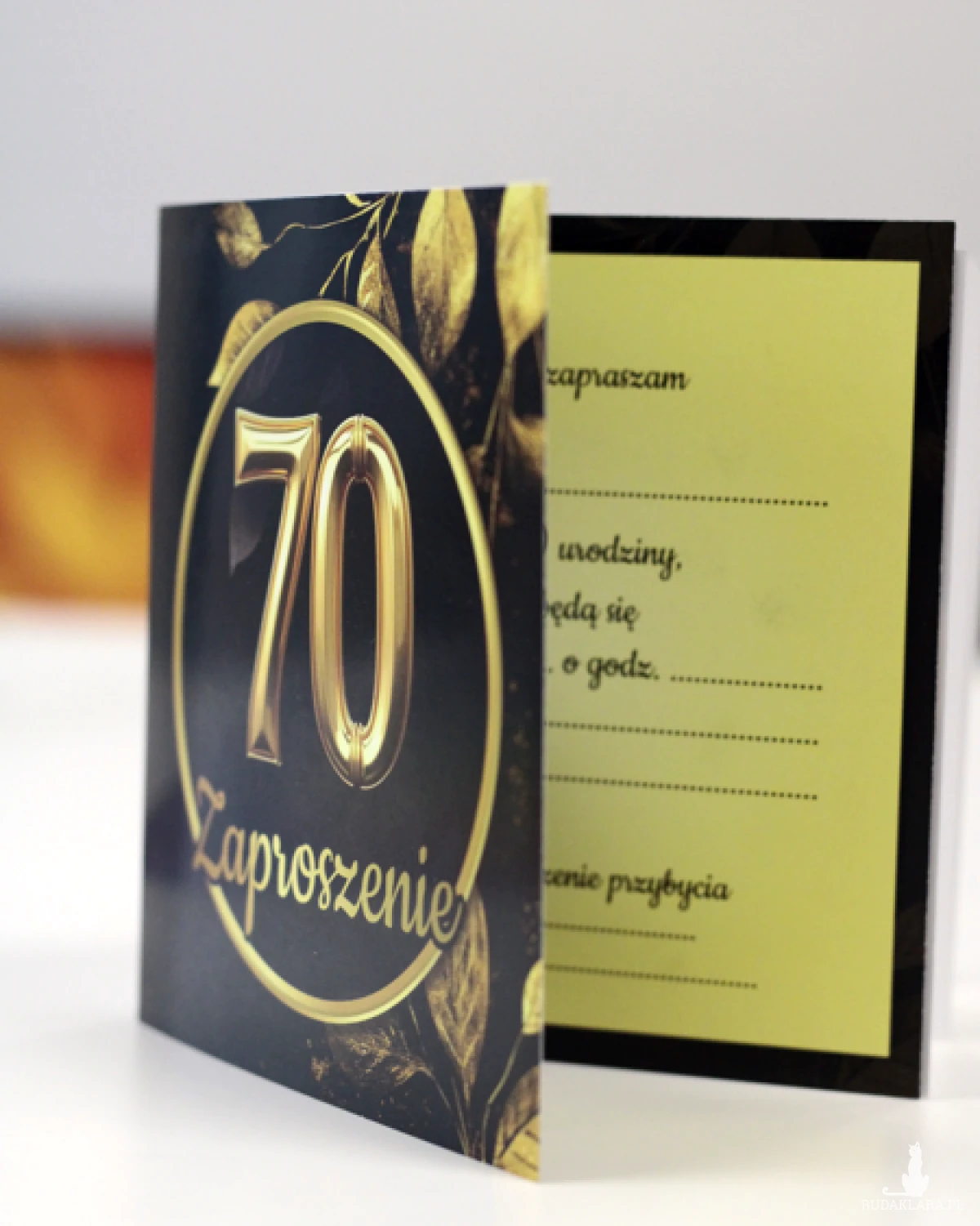 Zaproszenie na imprezę z okazji 70 urodzin. Zaproszenie składane do formatu 14x14. Wydruk cyfrowy na papierze kredowym o gramaturze 250g.